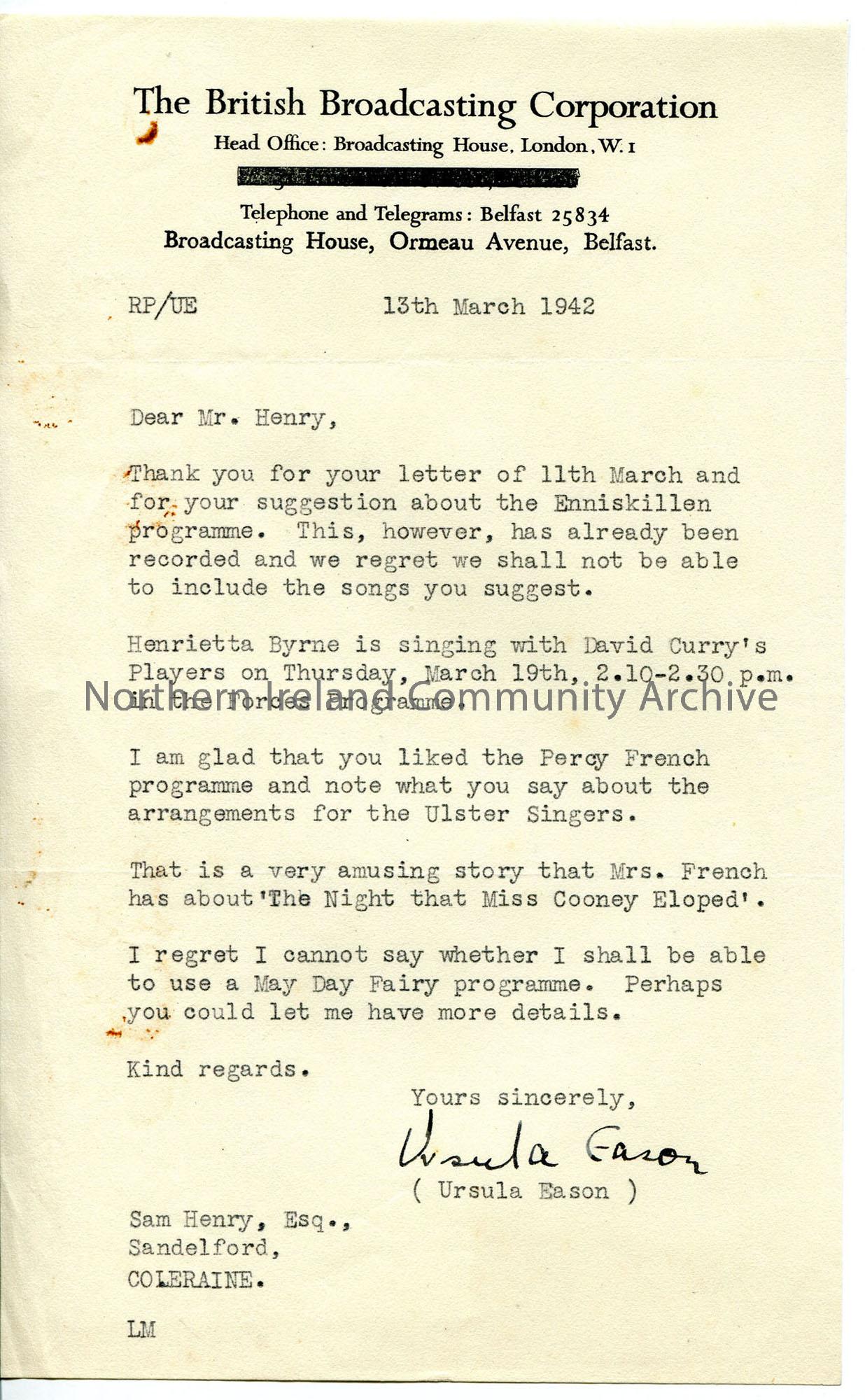 Typed letter on BBC headed notepaper. Discusses various programmes. Cannot use Sam's suggestion of song for Enniskillen programme - already recorded; glad Sam liked programme about Percy French and singing arrangements; not yet sure of May day Fairy programme.