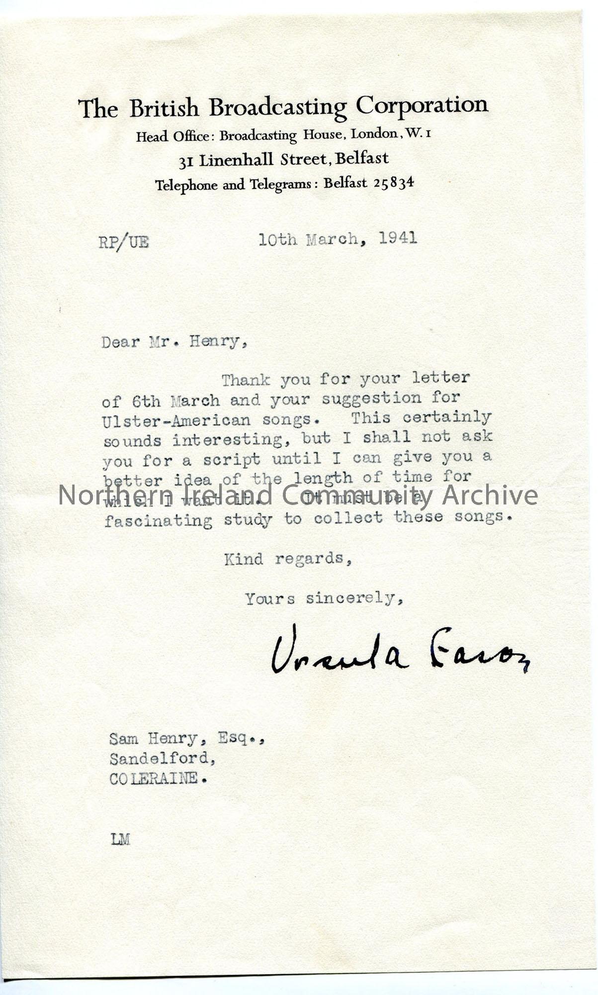 Typed letter on BBC headed notepaper, relating to idea of programme on Ulster-American songs