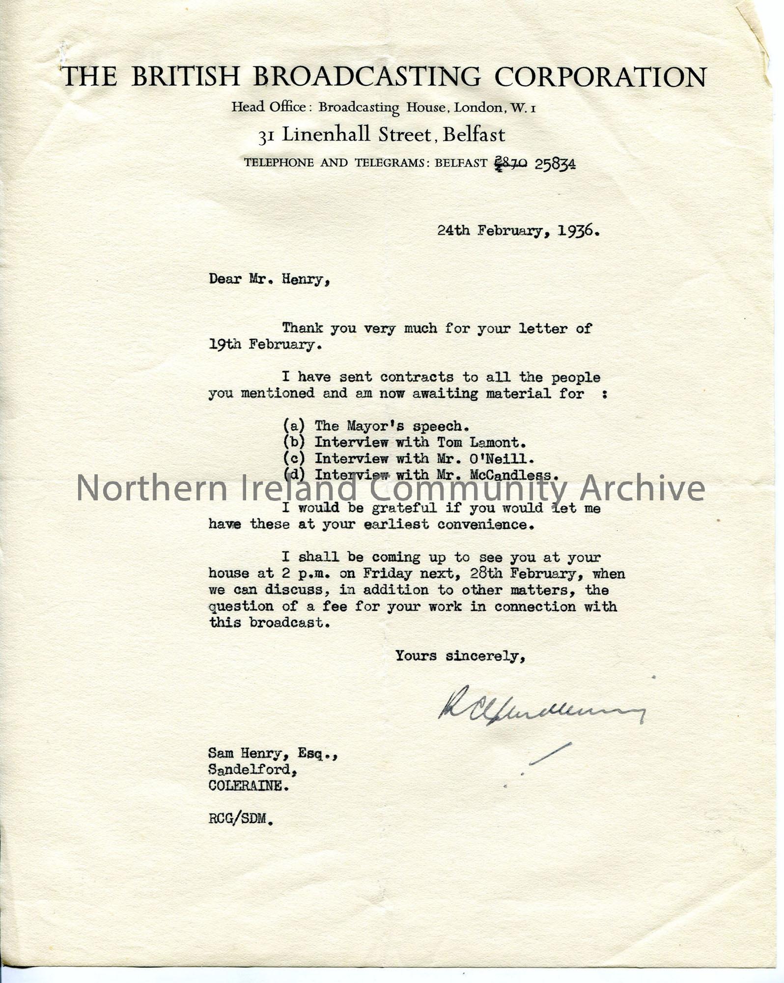 Typed letter on BBC headed notepaper relating to the ‘Provincial Journey’ programme. Advises sam contracts have been sent to all involved and list mat…
