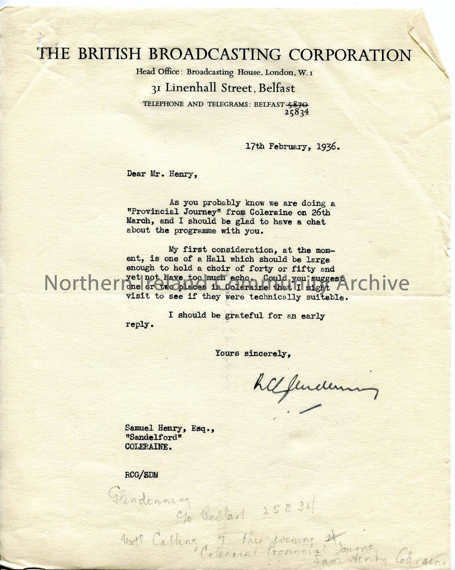 Typed letter on BBC headed notepaper relating to the ‘Provincial Journey’ programme. Asks Sam for suggestions of place in Coleraine adequate in size t…