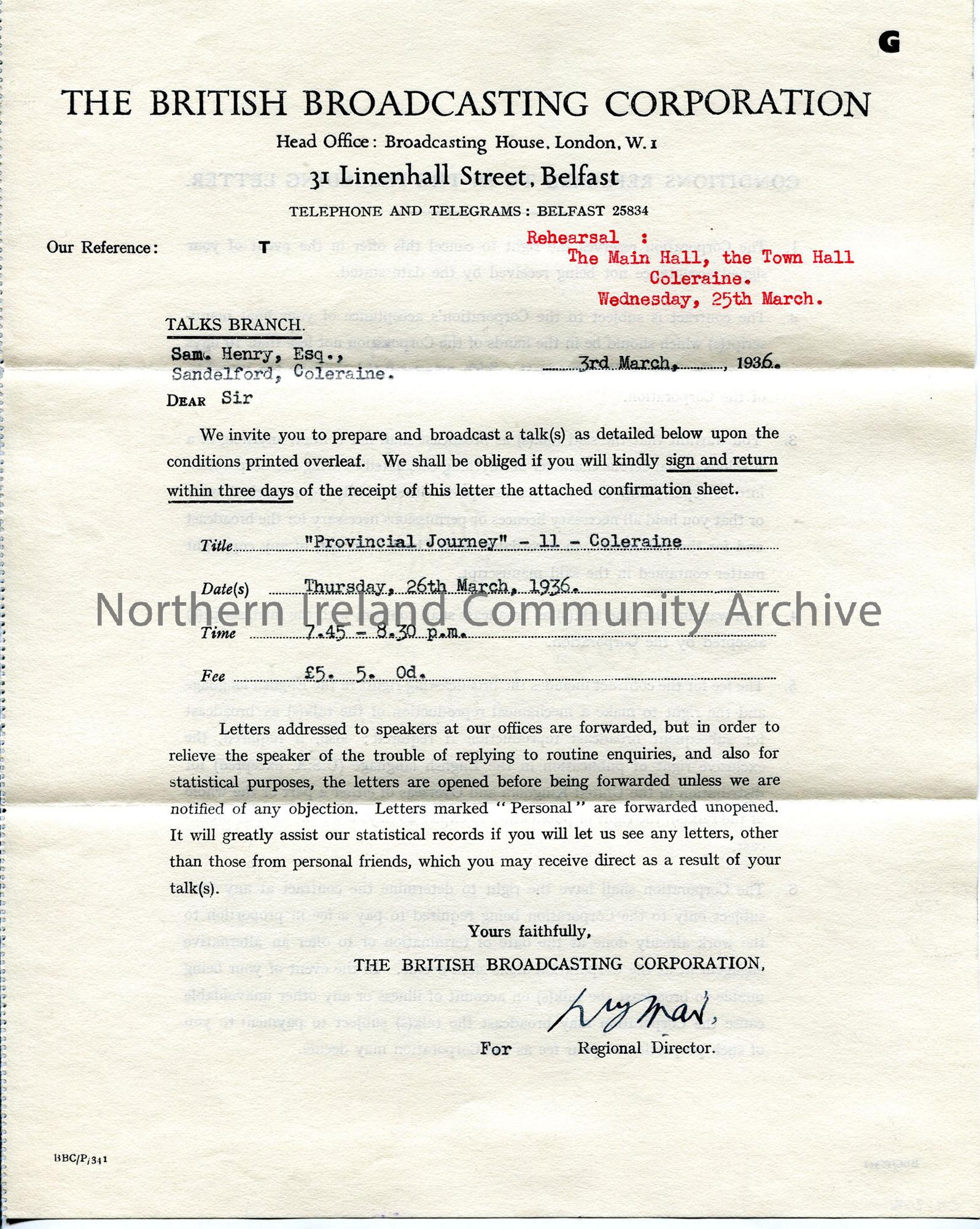Typed letter on BBC headed notepaper relating to the 'Provincial Journey' programme - formal agreement for the title, date, time and fee.