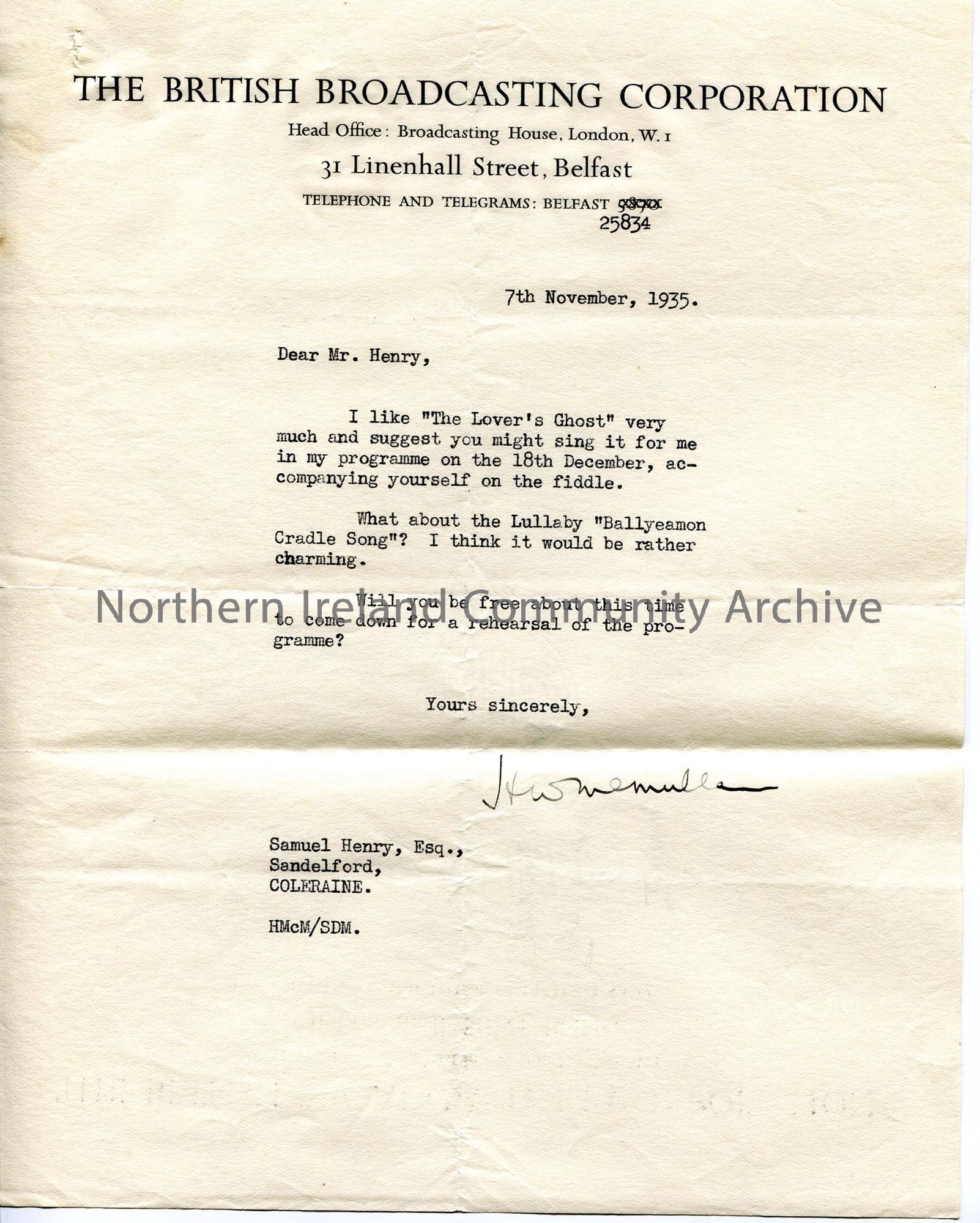 Typed letter on BBC headed notepaper, relating to ‘Ulster Christmas’ programme. Gives title of songs he likes and asks Sam to sing in the programme