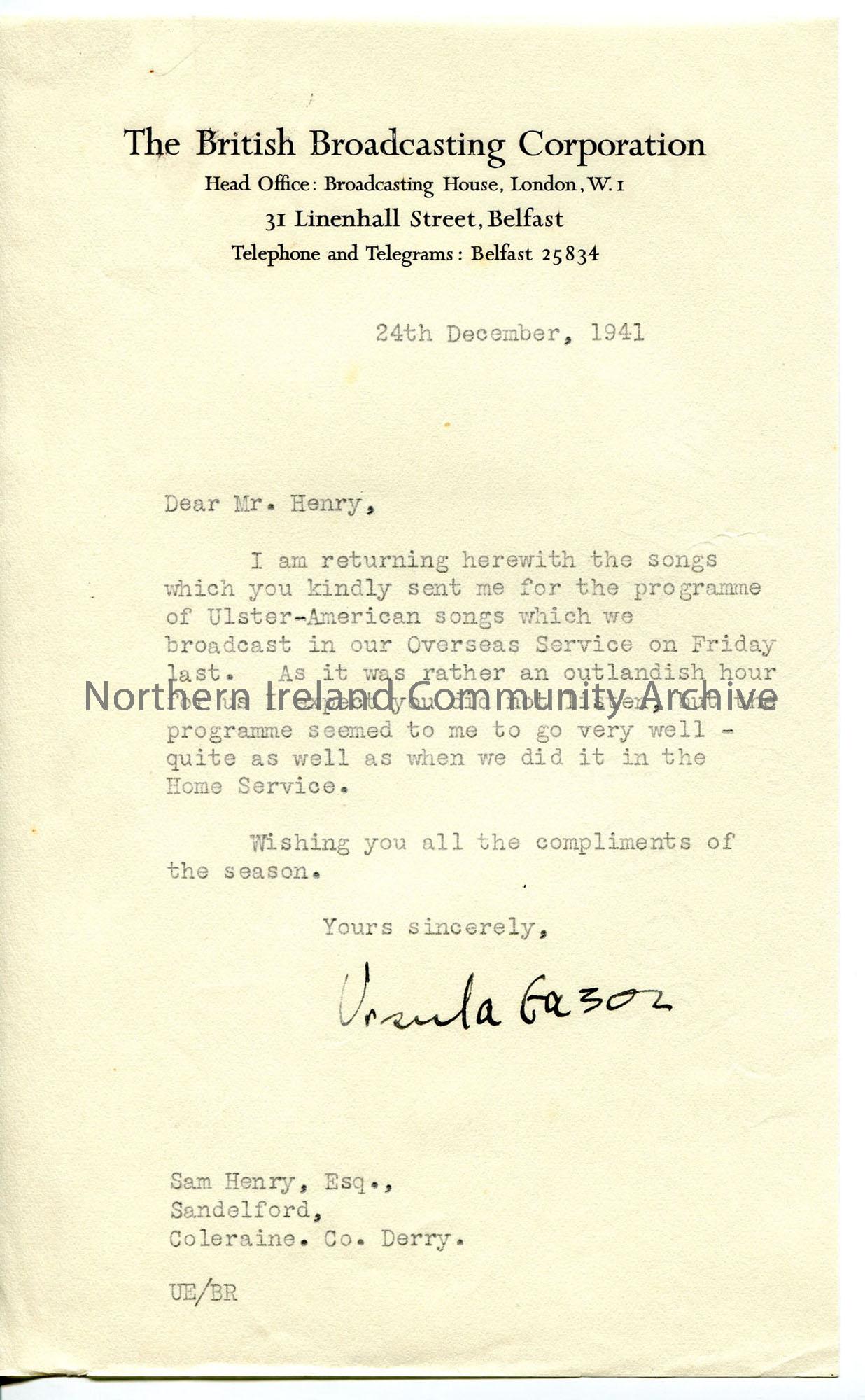 Typed letter on BBC headed notepaper. Returning songs loaned for overseas broadcast of Ulster-American songs