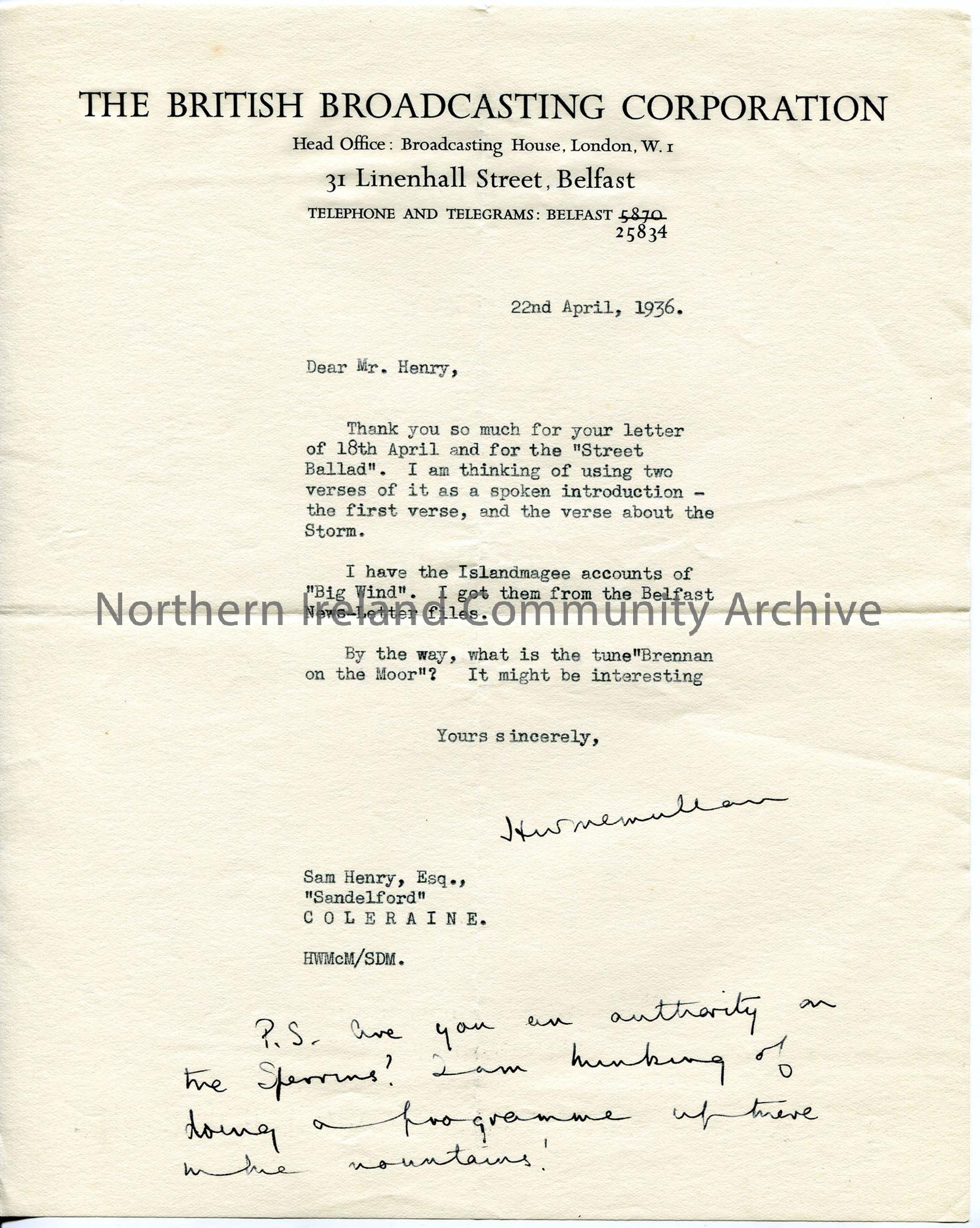 Typed letter on BBC headed notepaper. Thanks for ballad sent, will be used in programme, and question about another. Handwritten addition about potential programme on Sperrins