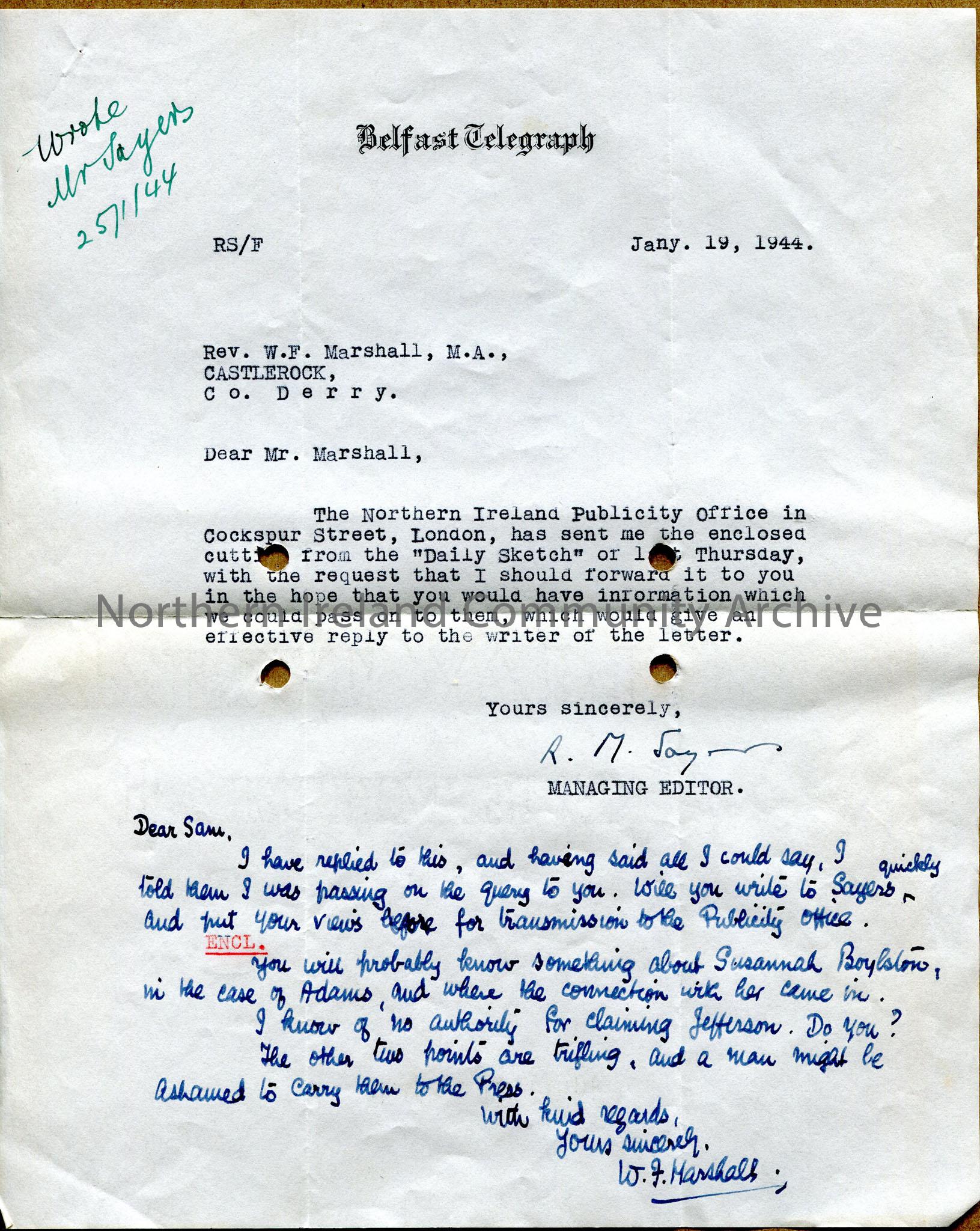 Typed letter, on Belfast Telegraph headed paper, to W F Marshall, asking for information on cutting forwarded from Northern Ireland Publicity Office in London. Marshall has handwritten in ink a message to Sam, to whom he is forwarding the letter, having told the Belfast Telegraph that he is doing so.