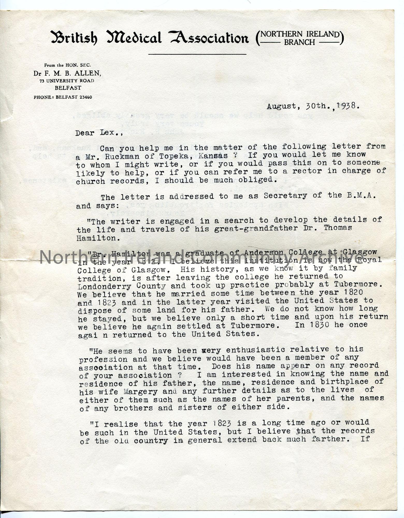 Typed letter on BMA headed notepaper. Relates to letter from Mr Ruckman of Kansas on behalf of someone wishing to research a Dr Hamilton from County Londonderry, who trained in Glasgow and left for America, early 19th century