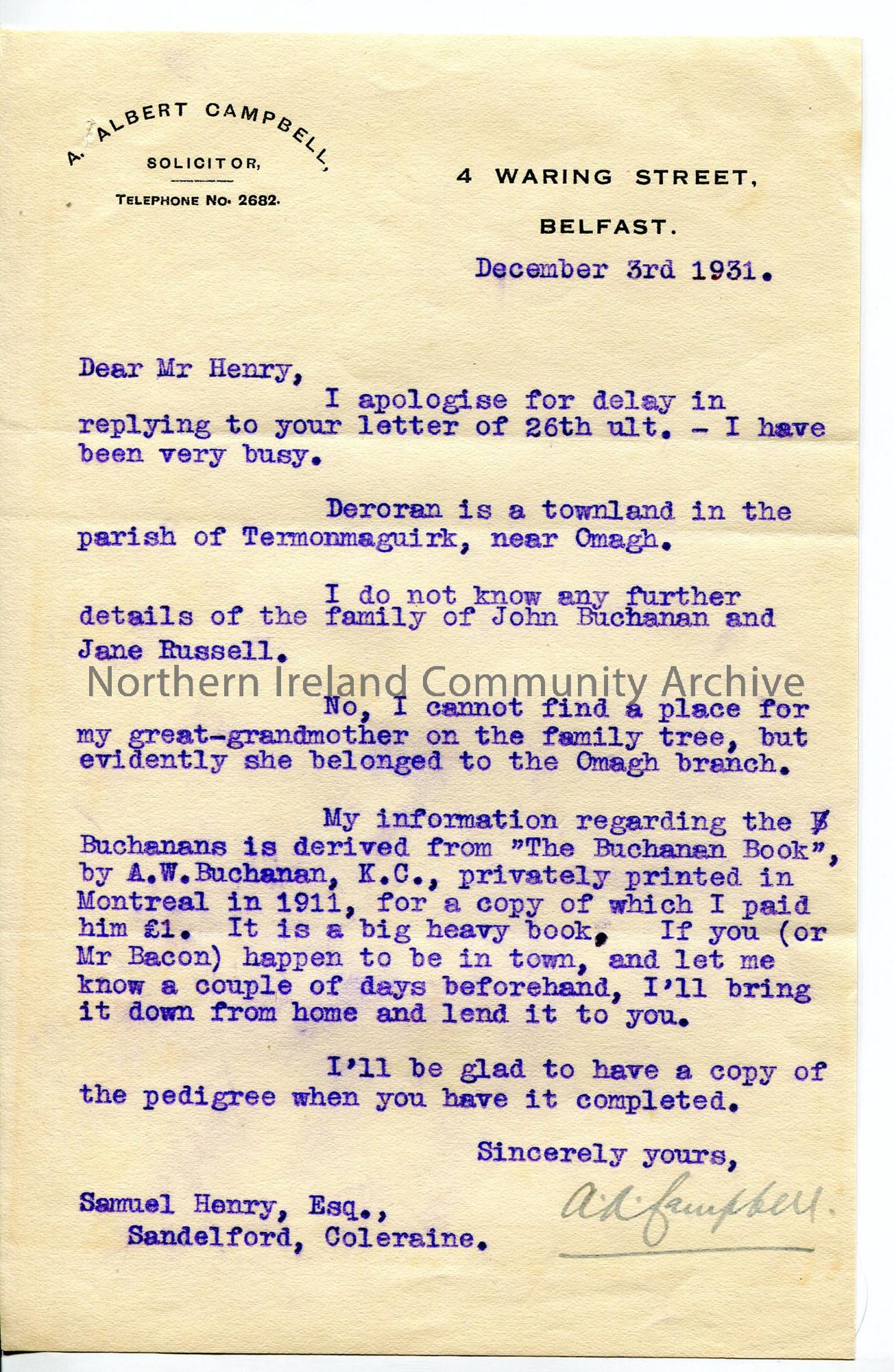 Typed letter on headed notepaper from Albert Campbell relating to the Buchanans – evidently part of his family line.