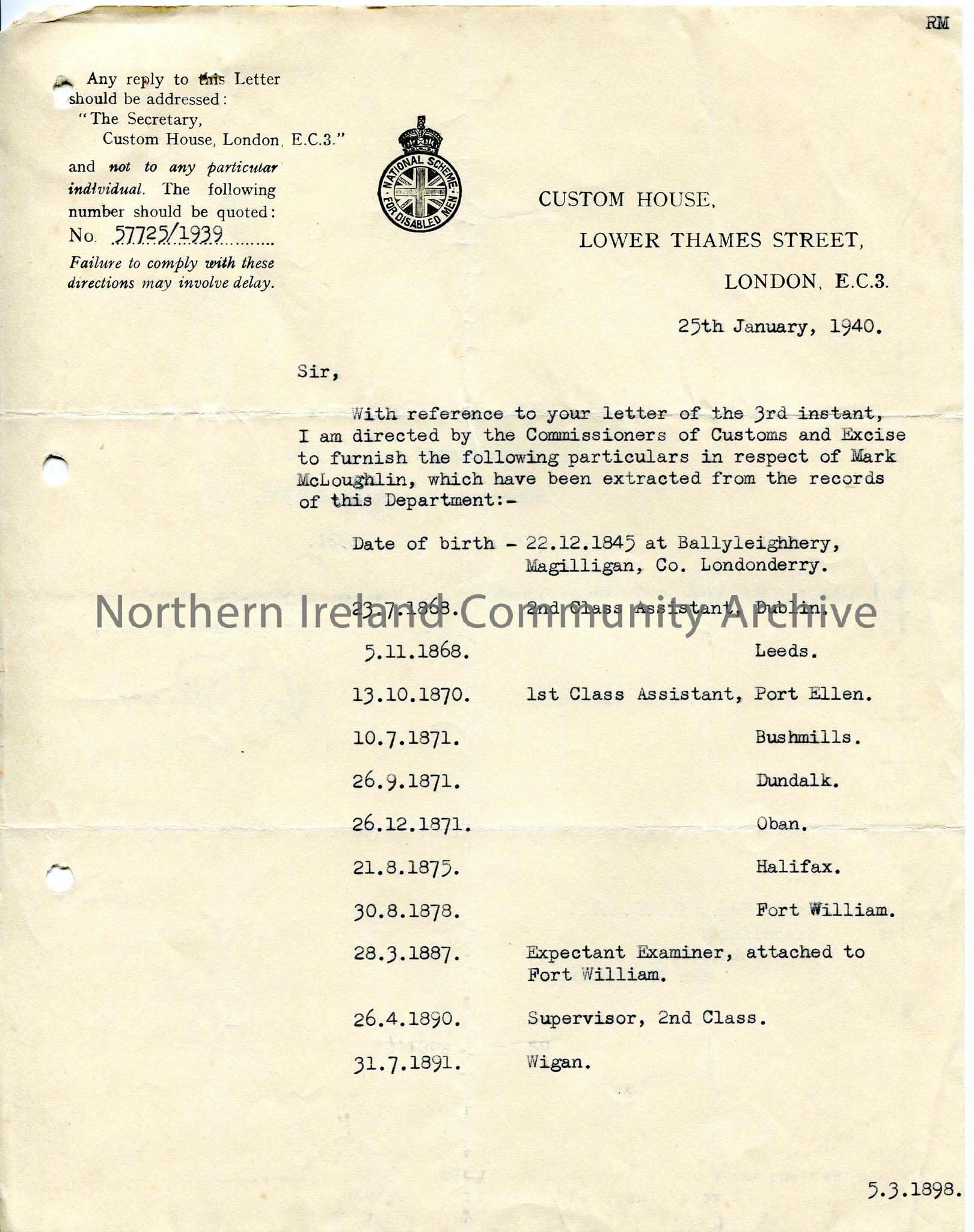 Typed letter on headed notepaper from Customs and Excise, with details and dates from Mark McLoughlin's record