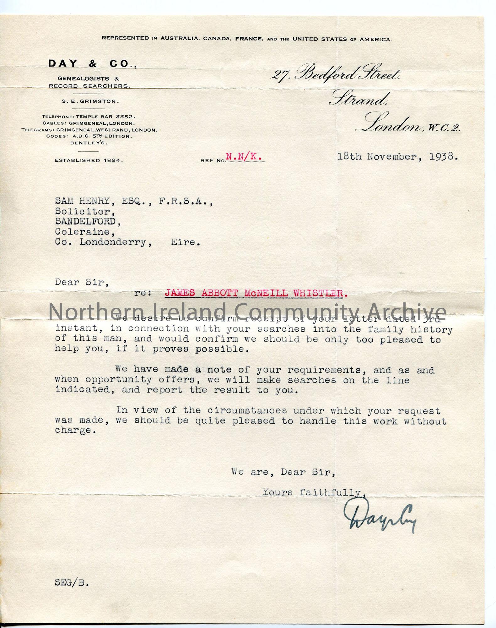 Typed letter on headed notepaper from Day & Co. relating to research into James Abbott McNeill Whistler (see attached) - willing to help Sam without charge.