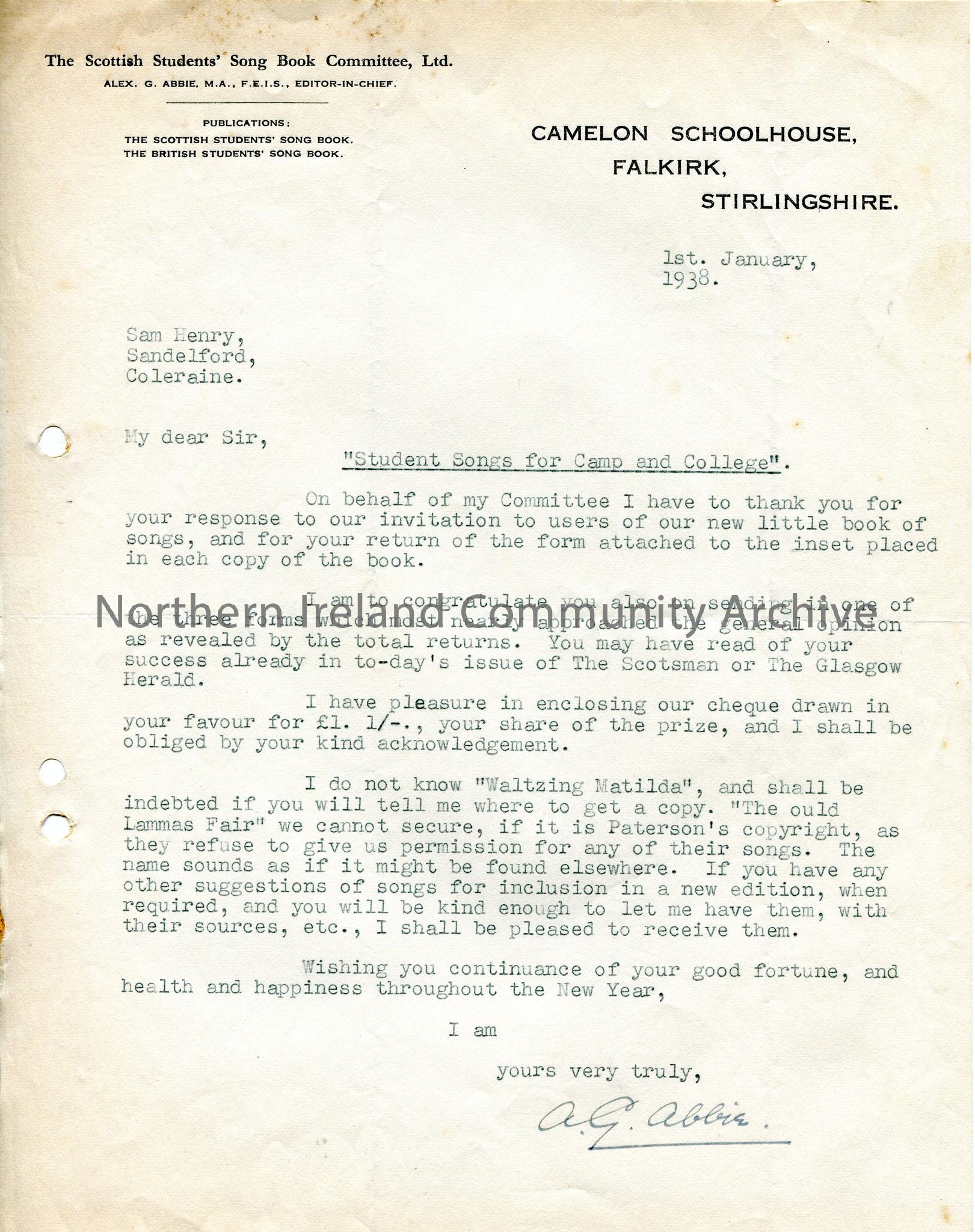 Typed letter on headed notepaper from Editor-in-chief of The Scottish Students' Song Book Committee. Relates to Sam having won share of prize for review of Committee's song book. Also refers to 'Oul Lammas Fair' and difficulties with obtaining it as Paterson's copyright refuses permission