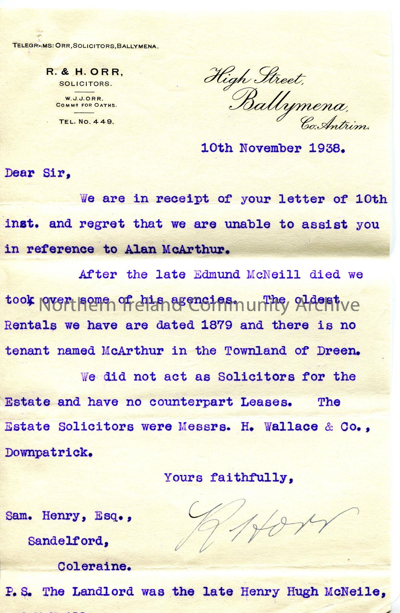 Typed letter on headed notepaper from Orrs, Solicitors. No tenant named McArthur in Dreen. Correct name of landlord - McNeile, not McNeill. Gives name of estate solicitors