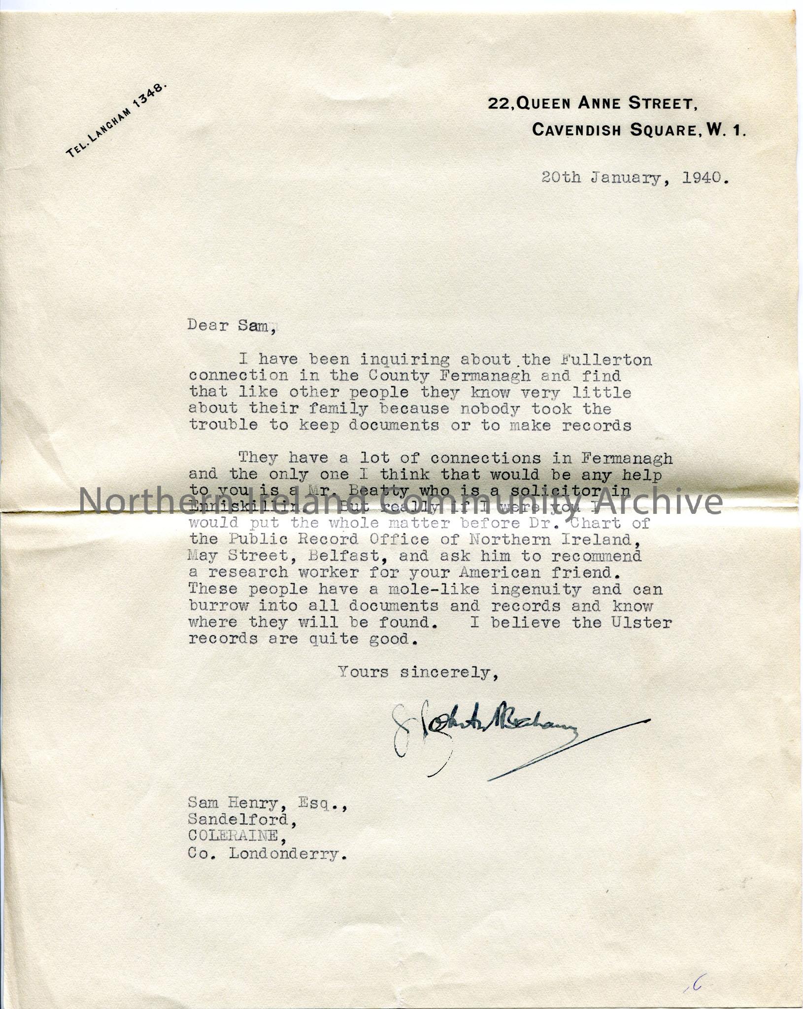 Typed letter on headed notepaper. Fullertons in Fermanagh know little about their history - advises him to contact Dr Chart of PRONI who could recommend a researcher and genealogist
