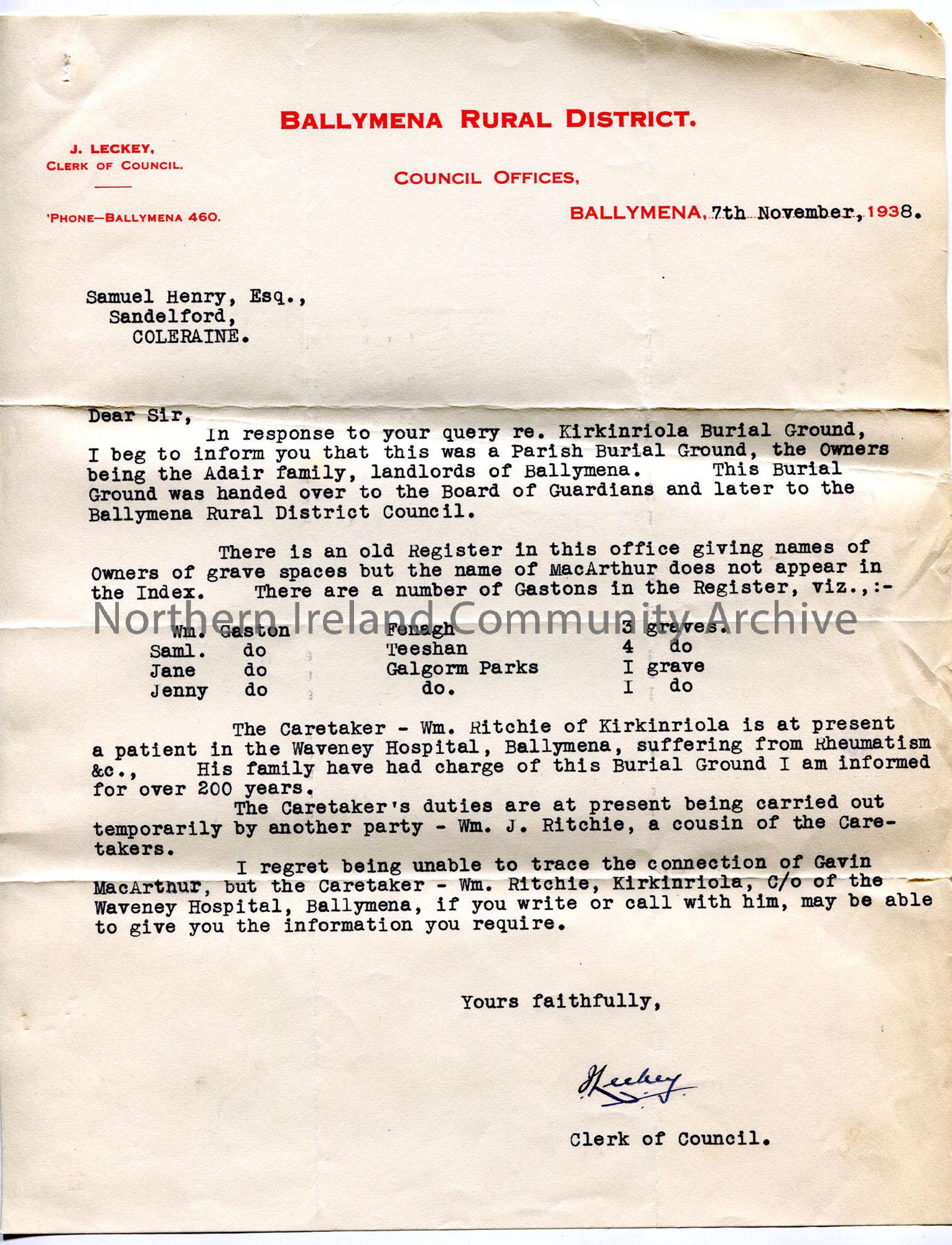 Typed letter on headed notepaper of Ballymena Rural District Council. Kirkinriola Burial Ground - private to Council ownership, records - no McArthur but lists other names. Advised to contact graveyard caretaker called Ritchie - same family has been doing it for 200 years