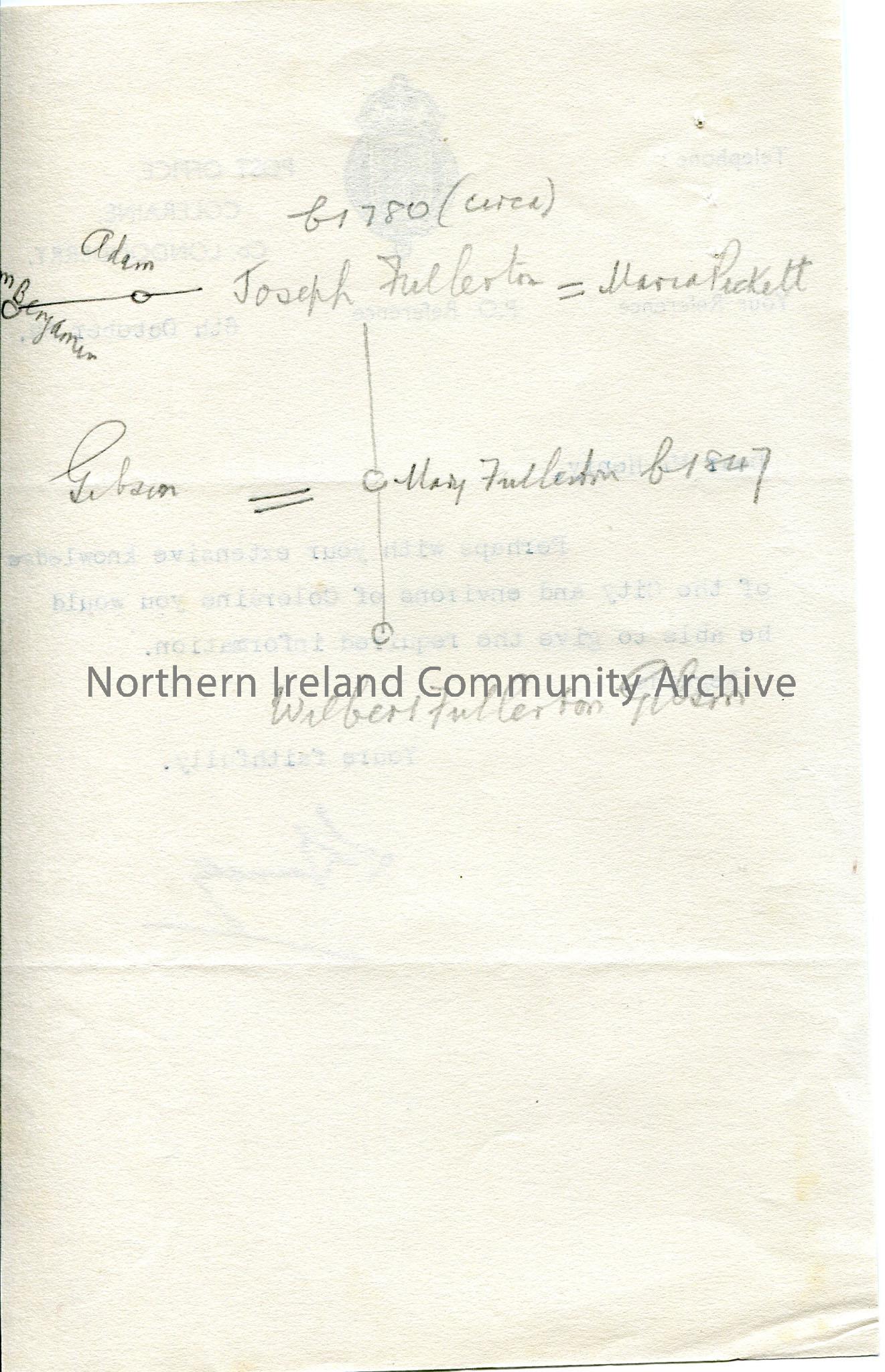 Typed letter on headed notepaper of Coleraine Post Office. Sam may be able to give require information [referring to accompanying letter from American resident sent to P.O. master]. Handwritten rough notes on reverse re Fullerton family line.