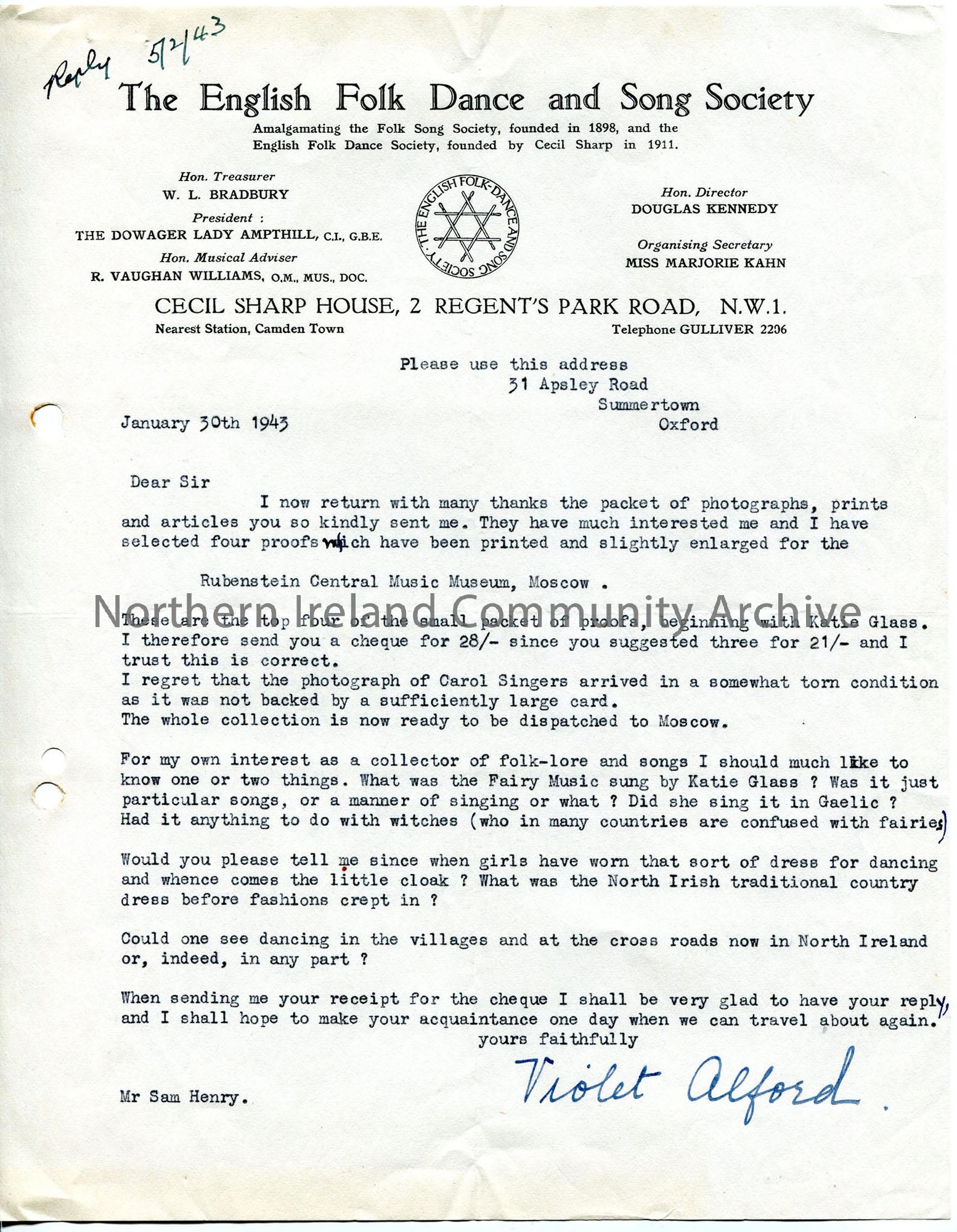 Typed letter on headed notepaper of English Folk Dance and Song Society – they have chosen photographs of Katie Glass (Rathlin Island) to send to Rube…