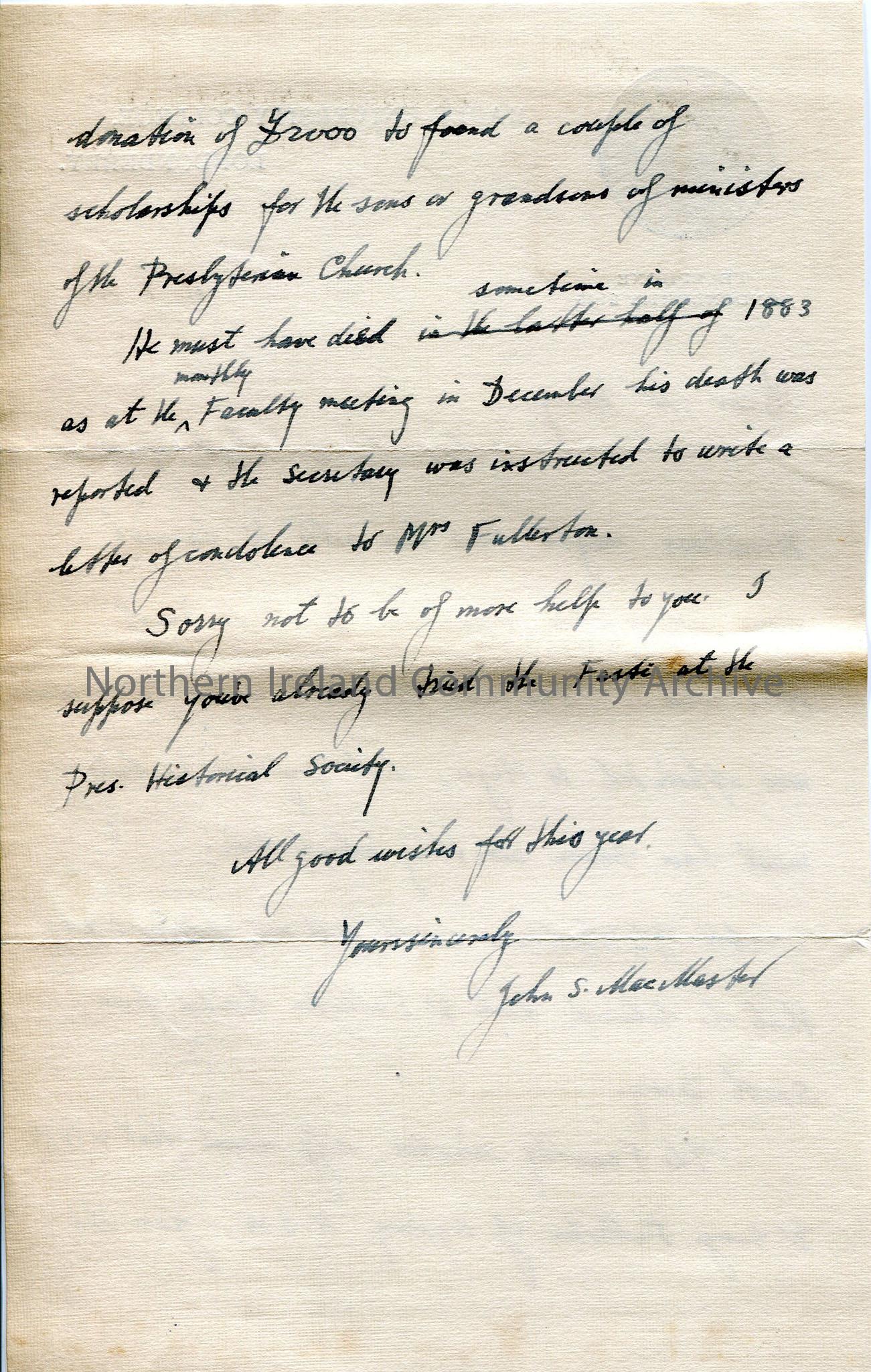 Typed letter on headed notepaper of Magee University - information re Dr George Fullerton of Sydney Australia who gave money to Magee University in 1879 for scholarships.