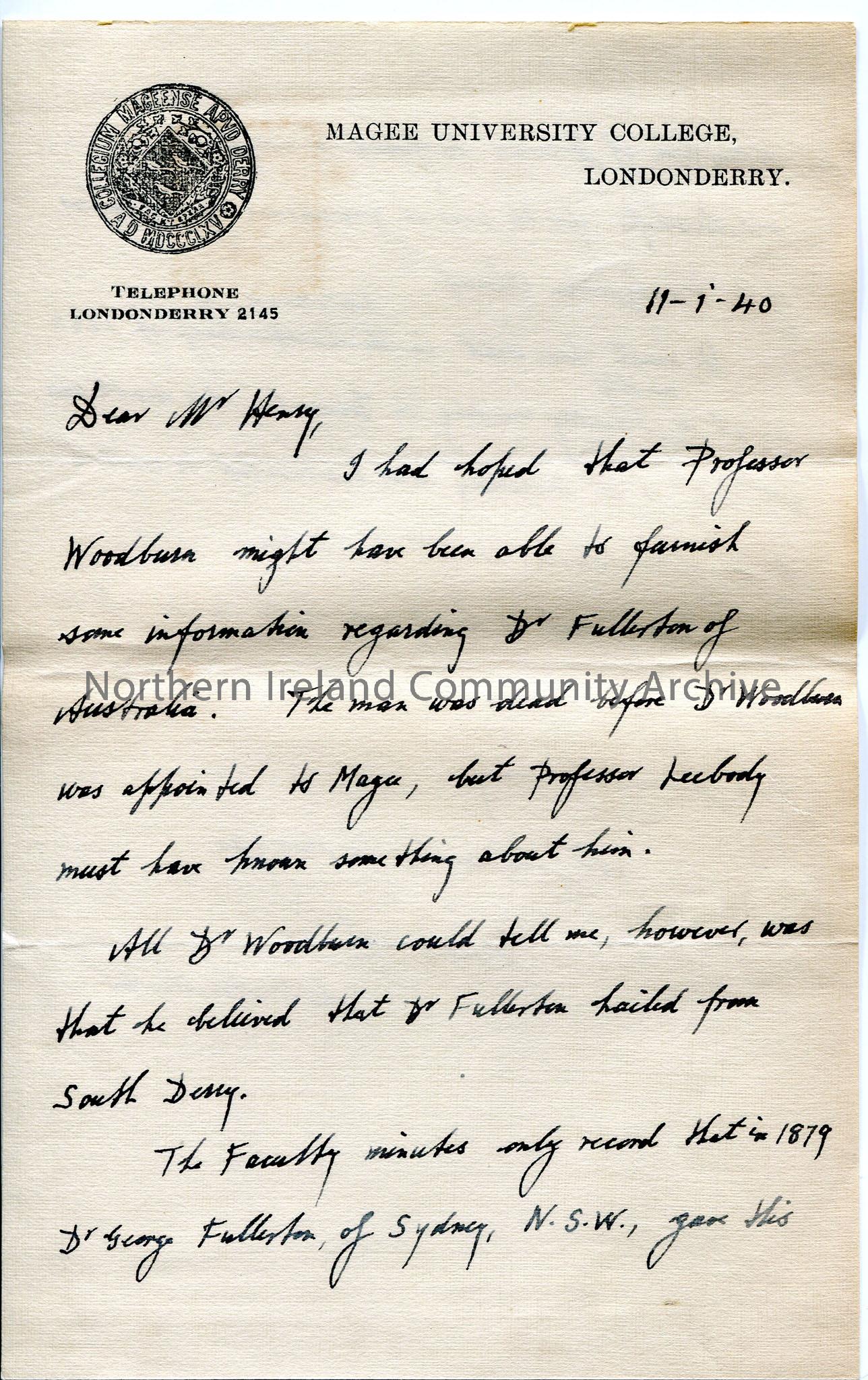 Typed letter on headed notepaper of Magee University – information re Dr George Fullerton of Sydney Australia who gave money to Magee University in 18…