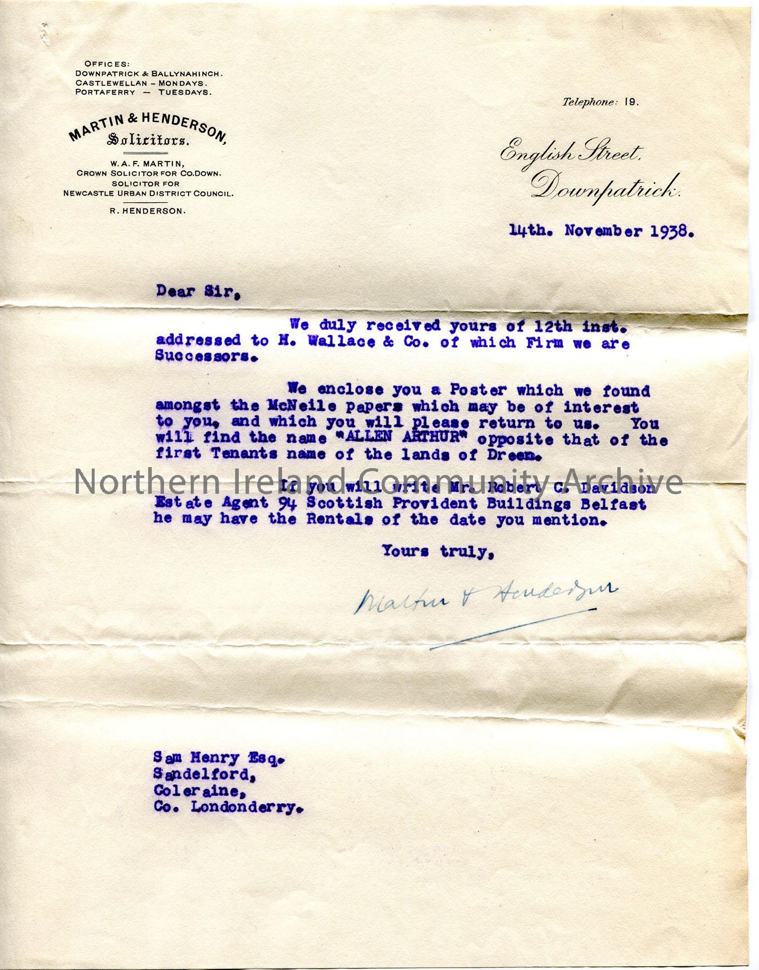 Typed letter on headed notepaper of Martin & Henderson Solicitors. Poster enclosed showing ‘Allen Arthur’ as first tenant of Dreen, on McNeile estate.