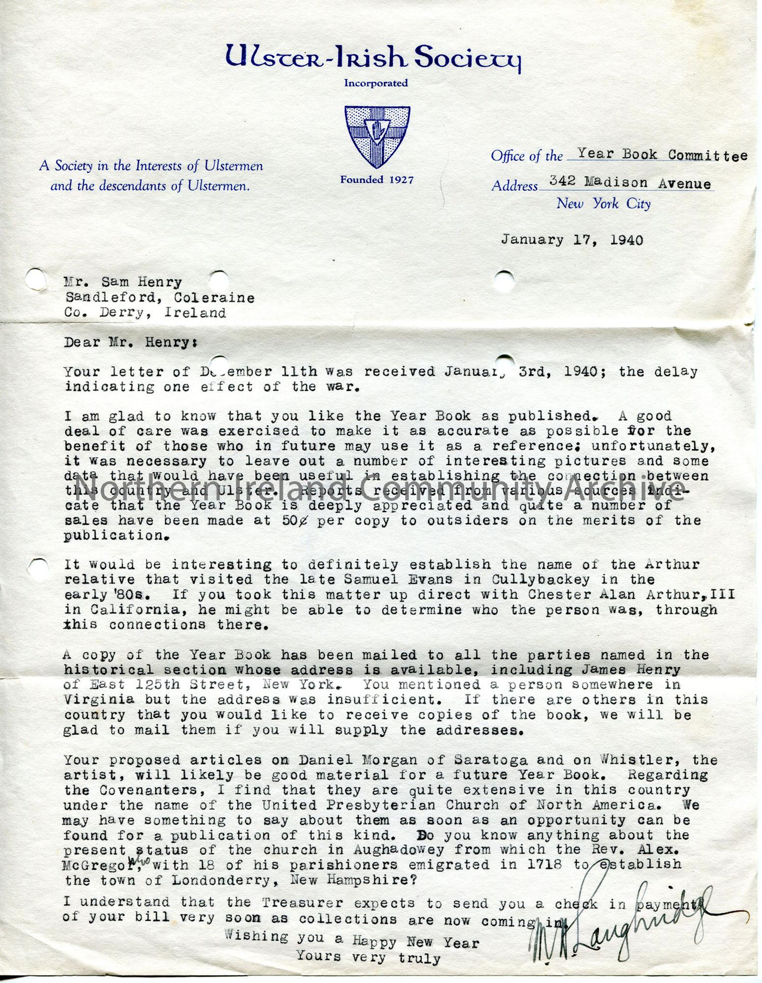 Typed letter on headed notepaper of Ulster-Irish Society. Would like to pinpoint more exactly the relative of Chester Arthur who visited in 1880s. Mentions other possible article subjects for future - Whistler, Covenanters, Rev Alex McGregor from Aghadowey who emigrated with parishioners in 1718 to set up Londonderry New Hampshire