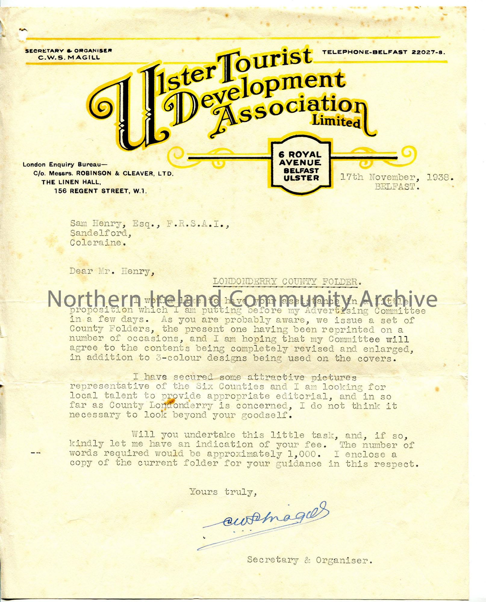 Typed letter on headed notepaper of Ulster Tourist Development Association. Approaching Sam for editorial for folder on County Londonderry.