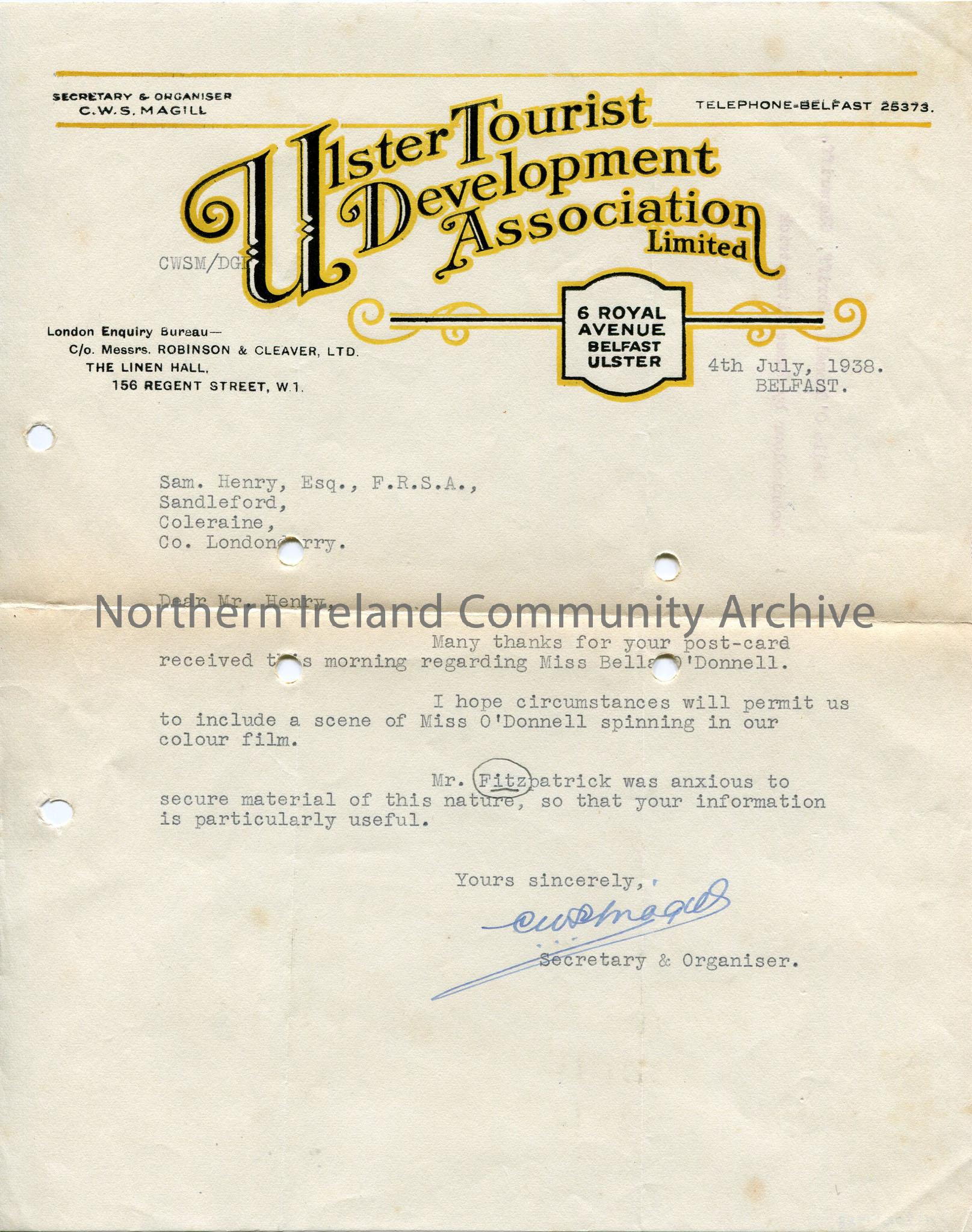 Typed letter on headed notepaper of Ulster Tourist Development Association, thanking Sam for photo of Miss Bella O’Donnell spinning
