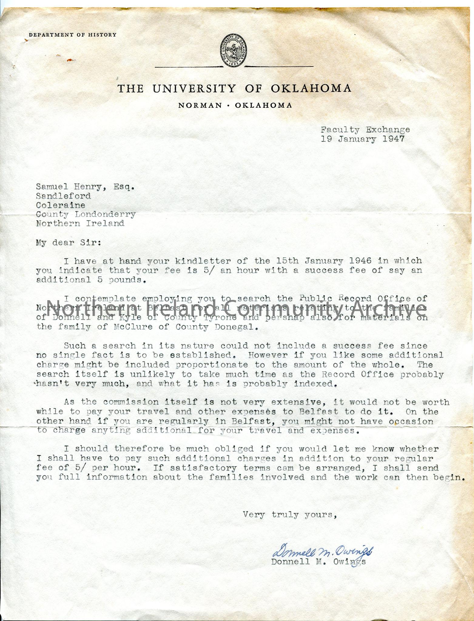 Typed letter on headed notepaper of University of Oklahoma, requesting research help for Donnells and Kyles of Tyrone and McClures of Donegal. Discusses fees.