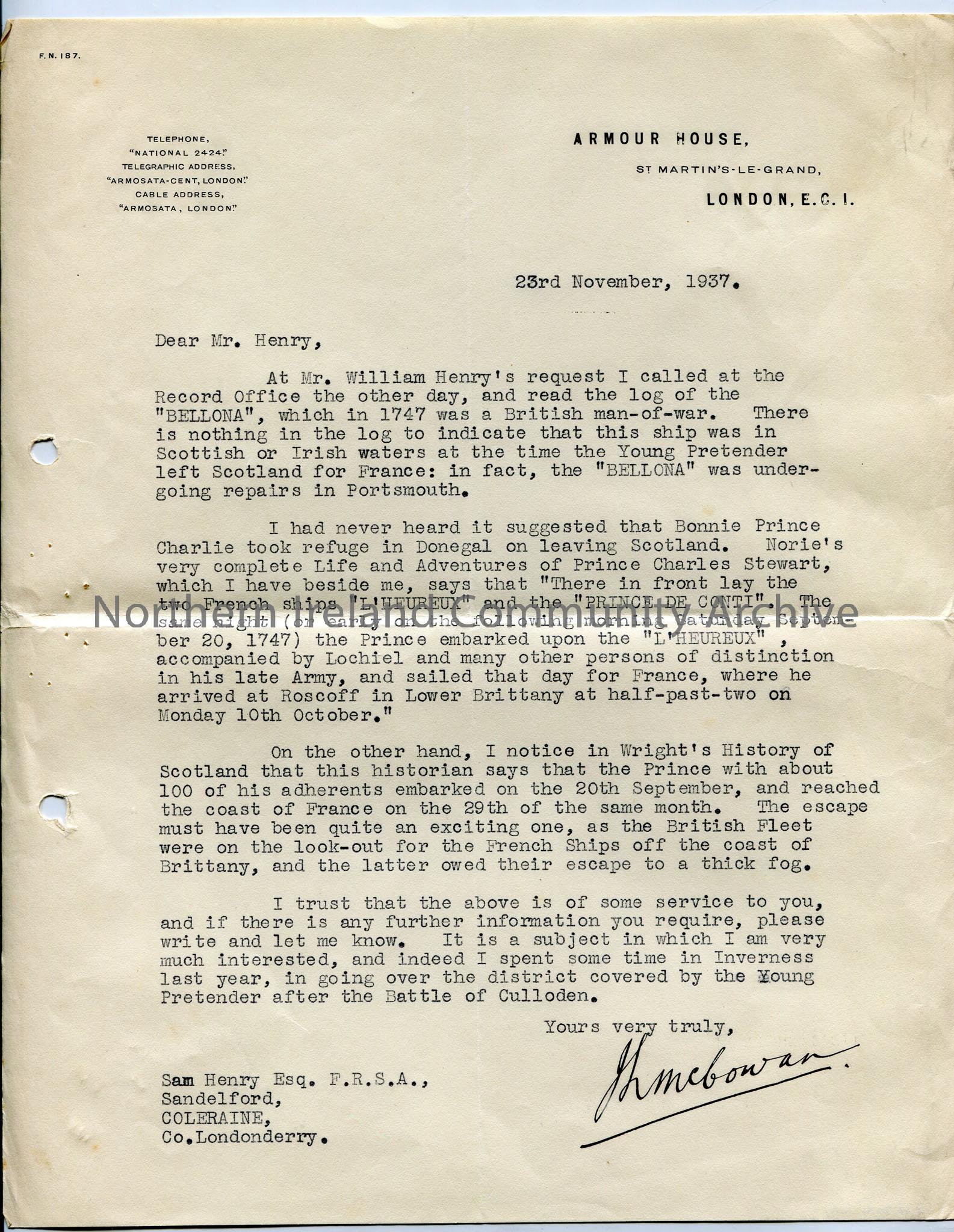 Typed letter on headed notepaper. Relates to searching records of British man-of-war Bellona - according to log, ship was in Porstmouth dock for repair at time of Bonnie Prince Charlie's escape from Scotland in 1746. Discusses 2 versions of escape.