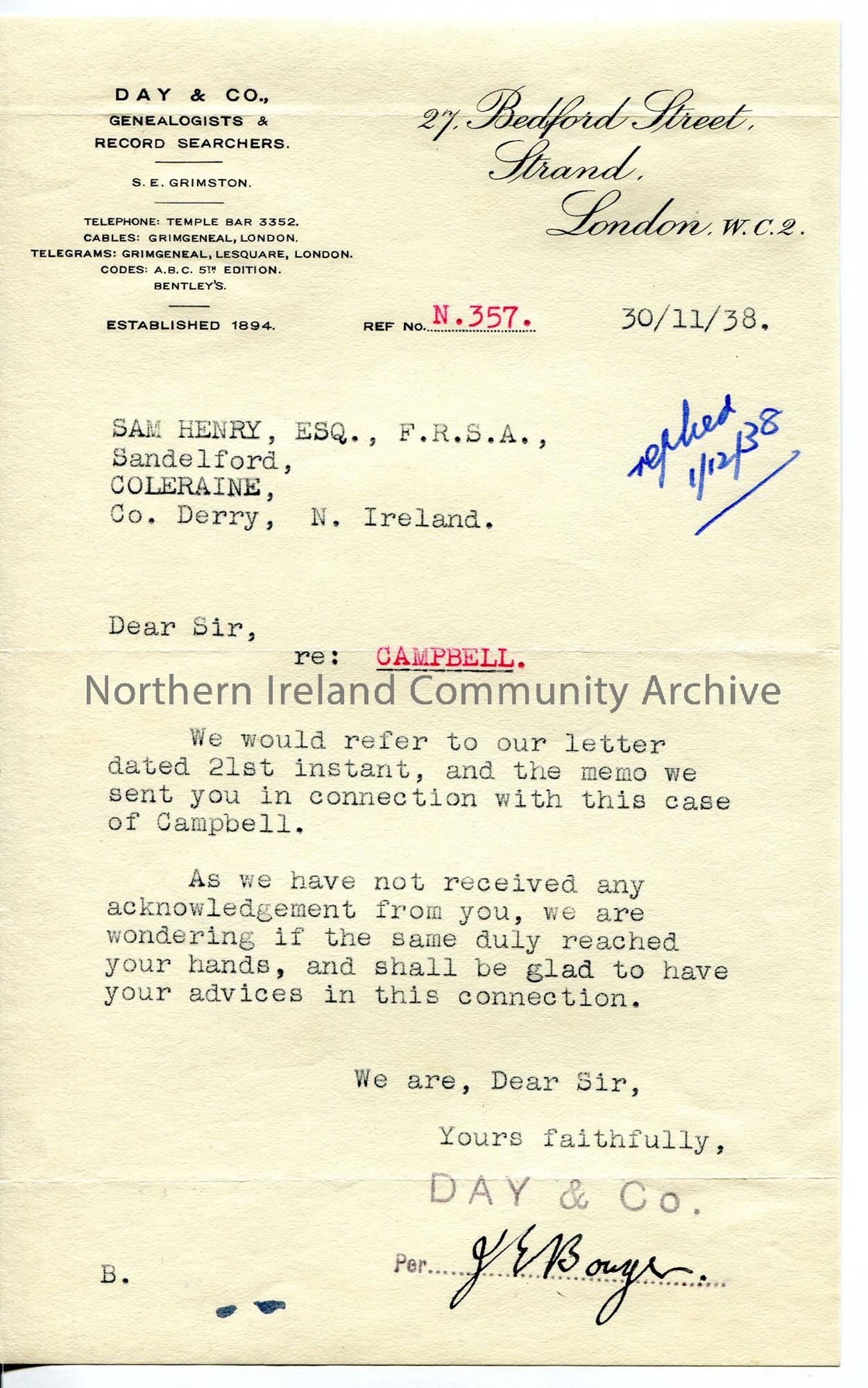 Typed letter on headed notepaper relating to ‘this case of Campbell’. Sam has added handwritten note ‘replied 1/12/38’