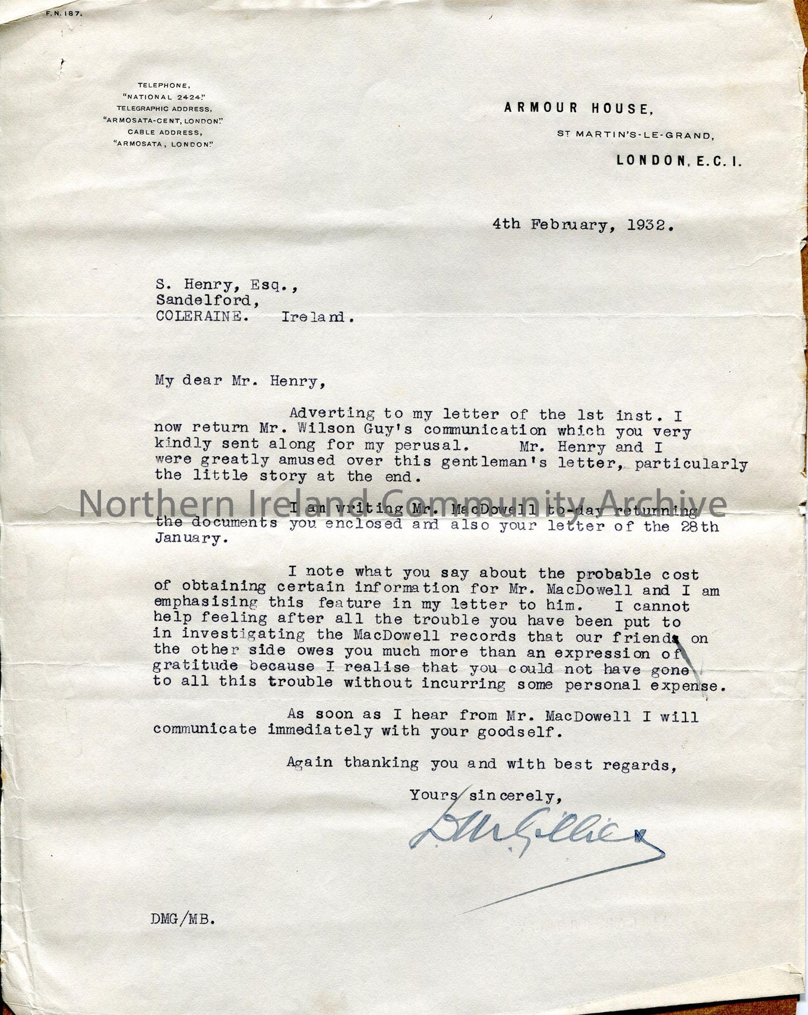 Typed letter on headed notepaper. Update re MacDowell – cost of research