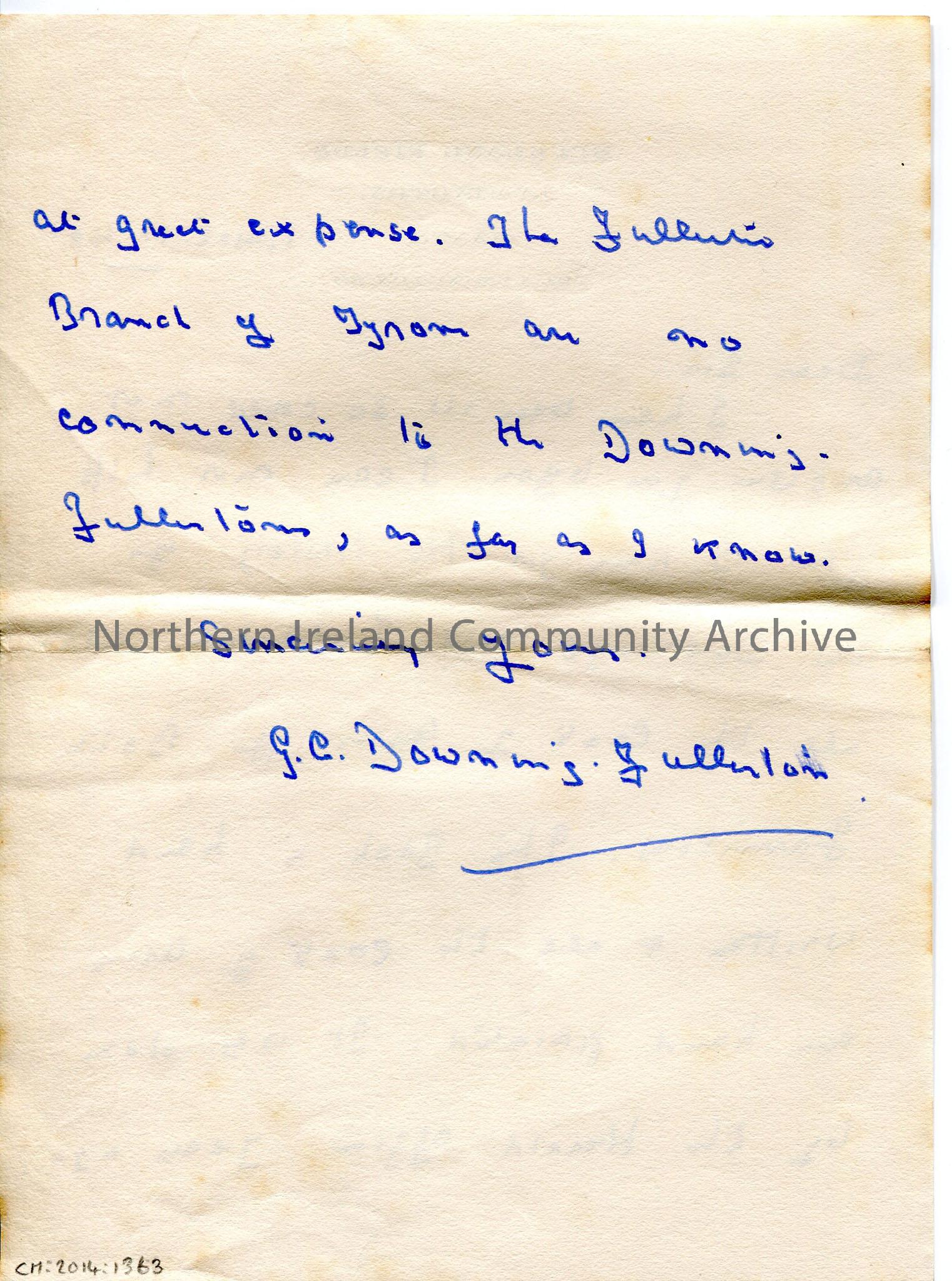 Typed letter on headed notepaper. Writer had been ill – sentences are brief – ‘I can not help you’. Relates to Fullerton family – has book, handwritte… – img039