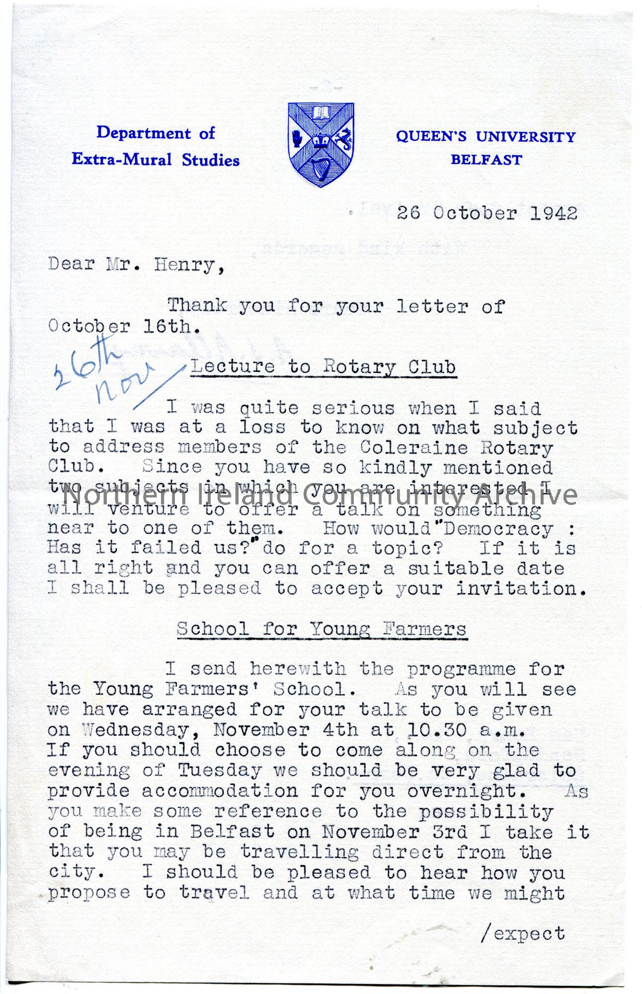 Typed letter on headed paper (double sided) to Sam Henry re lectures. Proposed to lecture at the Rotary Club on topic 'Democracy: Has it failed us?'. Sam to confirm a date - 26th November handwritten beside this. Discusses travel arrangements re Sam's lecture at the Young Farmers' School on 4th November 1942.
