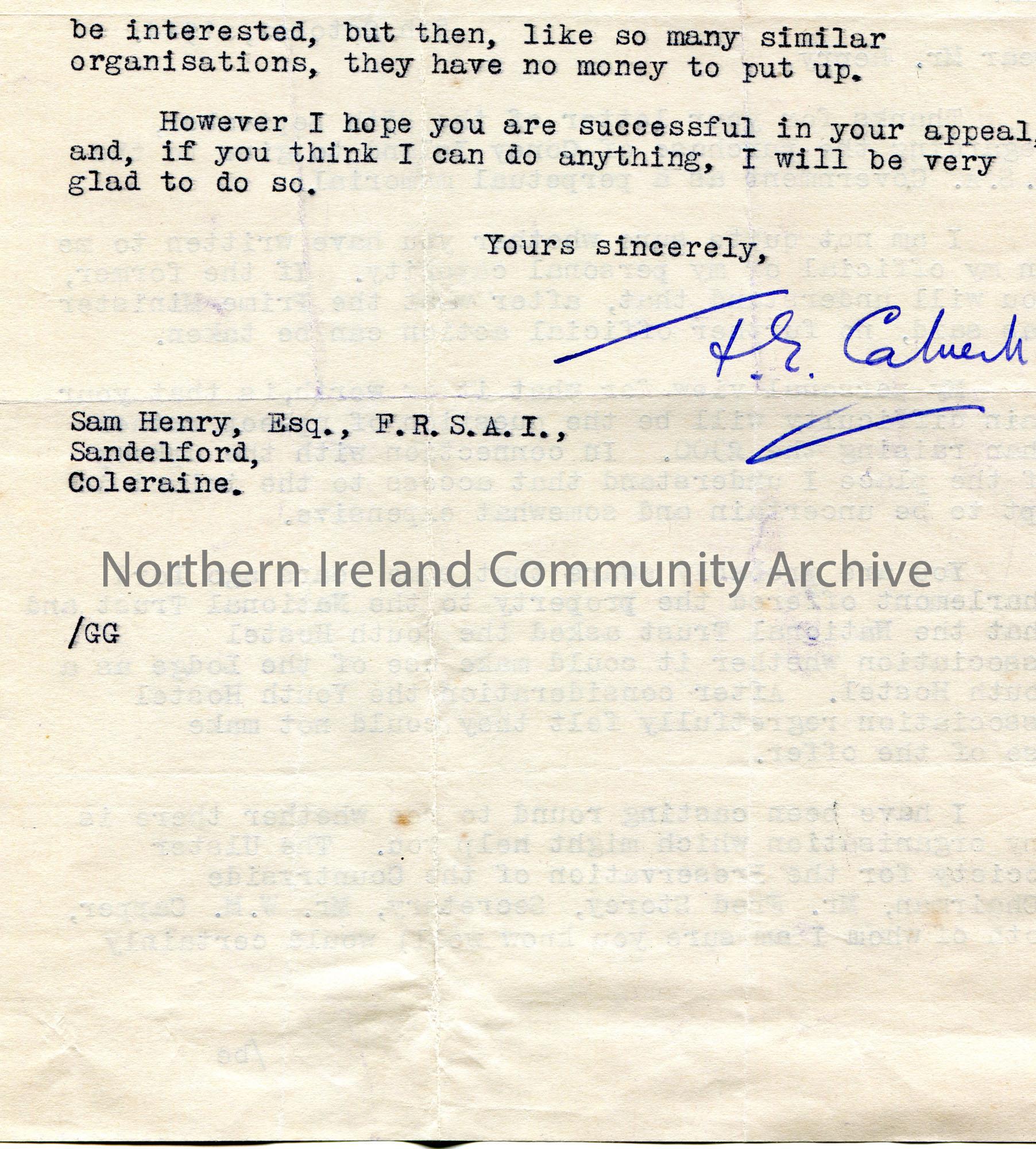 Typed letter on headed paper (double sided) to Sam Henry. Writing re the purchase of Coney Island. Advises that the upkeep of the island would cost more than the purchase price of £300. Suggests Sam contact 'The Ulster Society for the Preservation of the Countryside'.