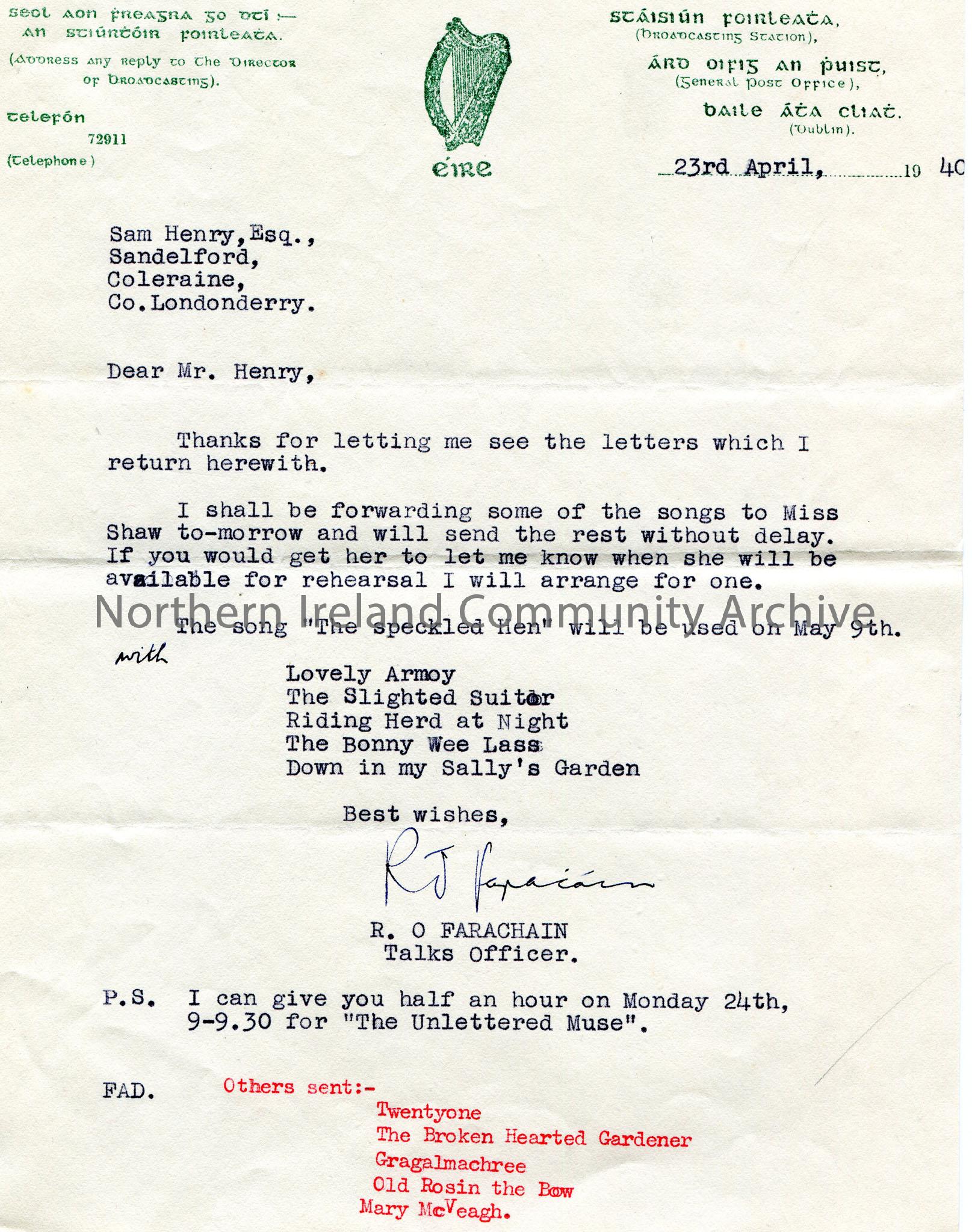 Typed letter on headed paper from R. O Farachain, Talks Officer. Dated 23rd April, 1940. Thanks Sam for sending him letters which have been returned. Talks of sending songs to Miss Shaw. Sam to find out when she will be available for rehearsal. Lists the songs which will be used on May 9th. Can give Sam half an hour on Monday 24th for "The Unlettered Muse".