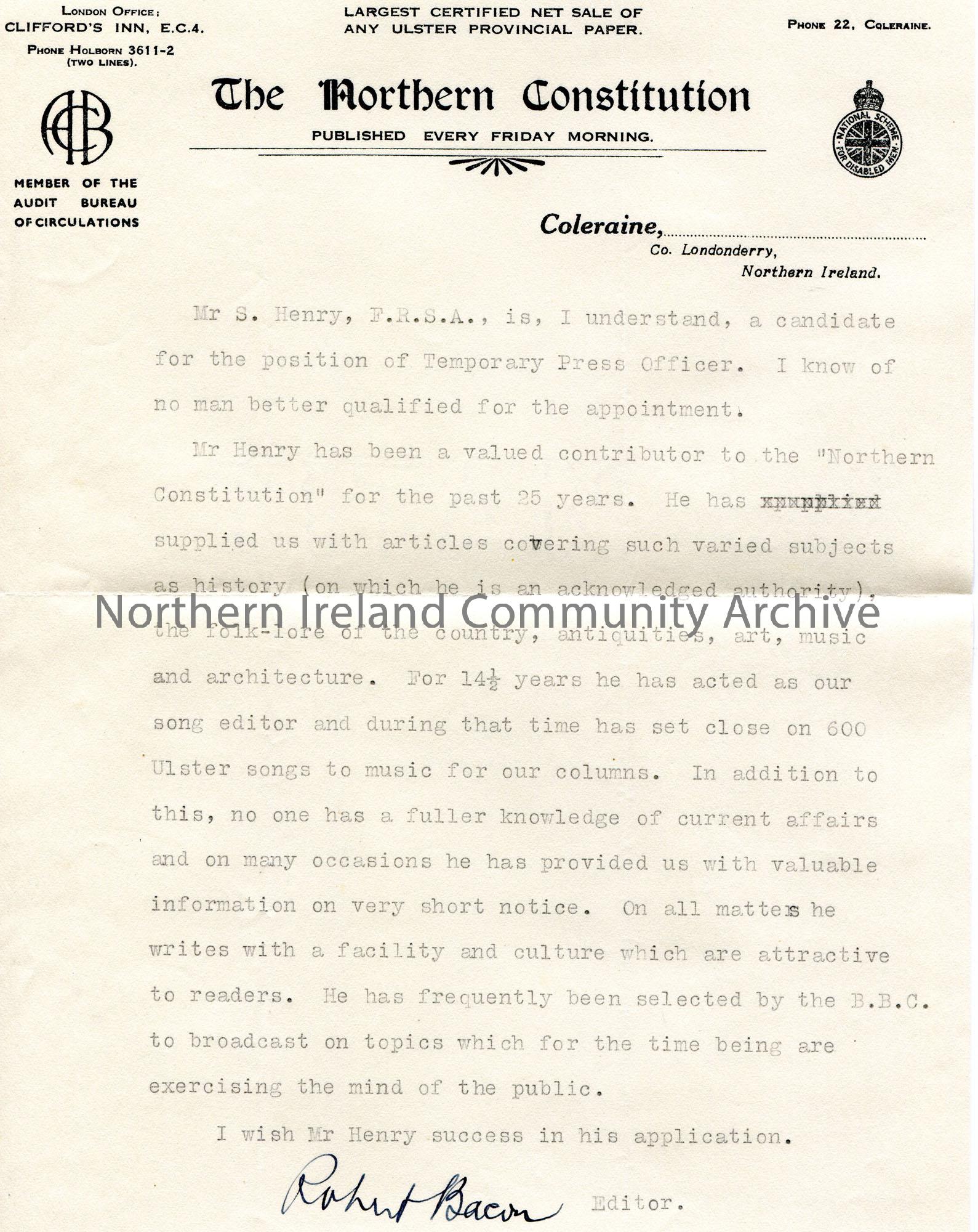 Typed letter on headed paper. Recipient not specified. Testimonial for Sam Henry's application for post of Temporary Press Officer at New Ulster House. Speaks highly of Sam's work at the Northern Constitution for the past 14 1/2 years. Writes of his working achievements.