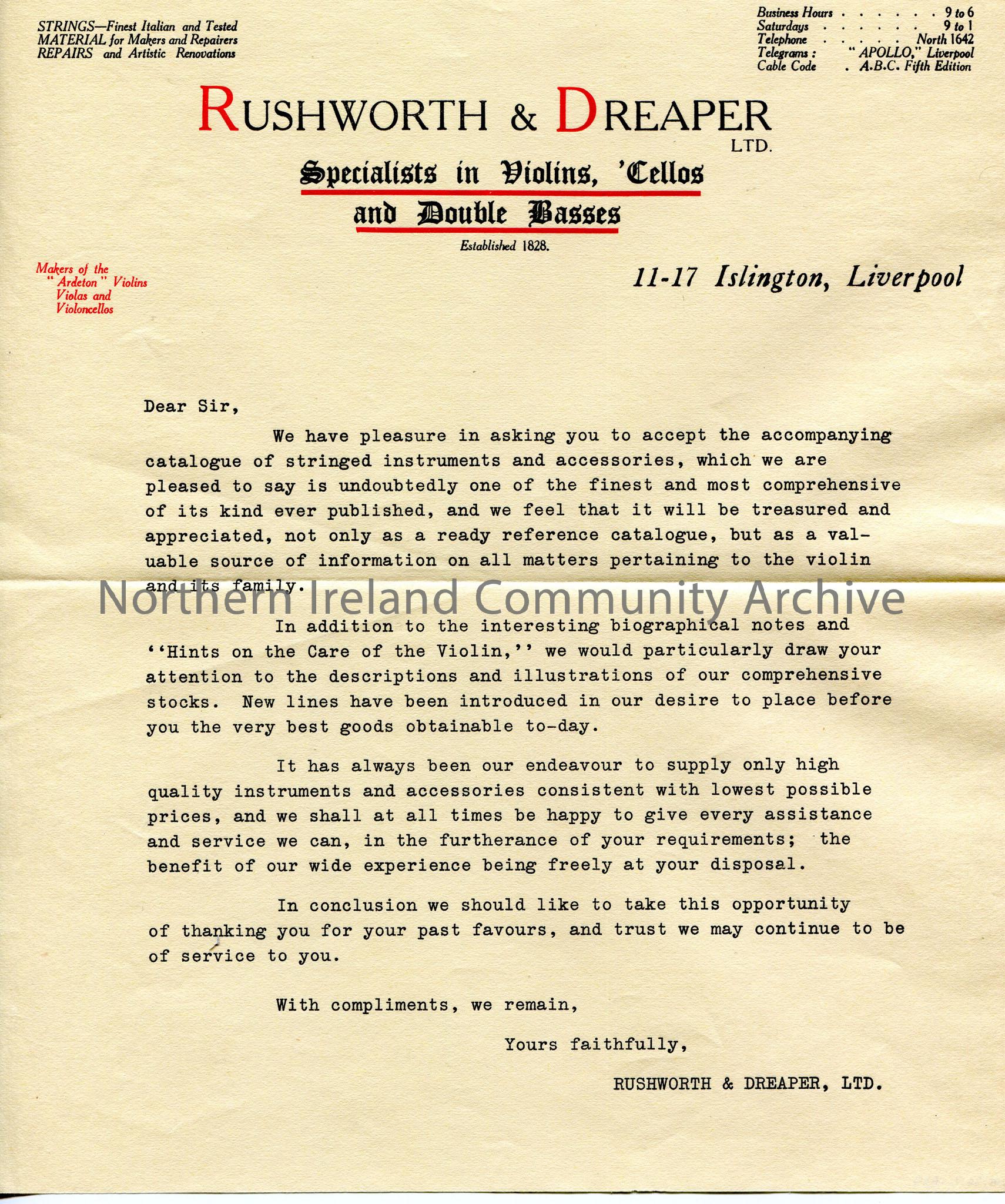 Typed letter on headed paper to 'Dear Sir'. Encloses catalogue re the violin. Draws attention to the new stock available as outlined in the catalogue. They are happy to assist with any requirements. Gives thanks for previous favours and continues to be of service.