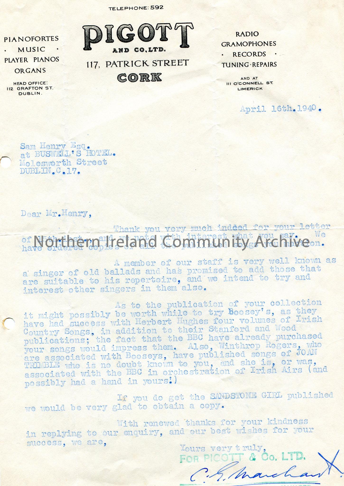 Typed letter on headed paper to Mr Sam Henry, at Buswell’s Hotel, Molesworth Street, Dublin, C17. They have ordered copies of published songs mentione…