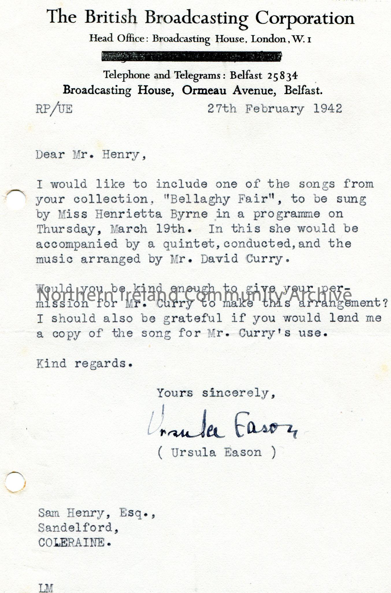 Typed letter on headed paper to Mr Sam Henry, Sandelford, Coleraine. Asking for Sam's permission for use of the song 'Bellaghy Fair' to be sung by Miss Henrietta Byrne for a programme on 19th March 1942. Music to be arranged by Mr [David] Curry.