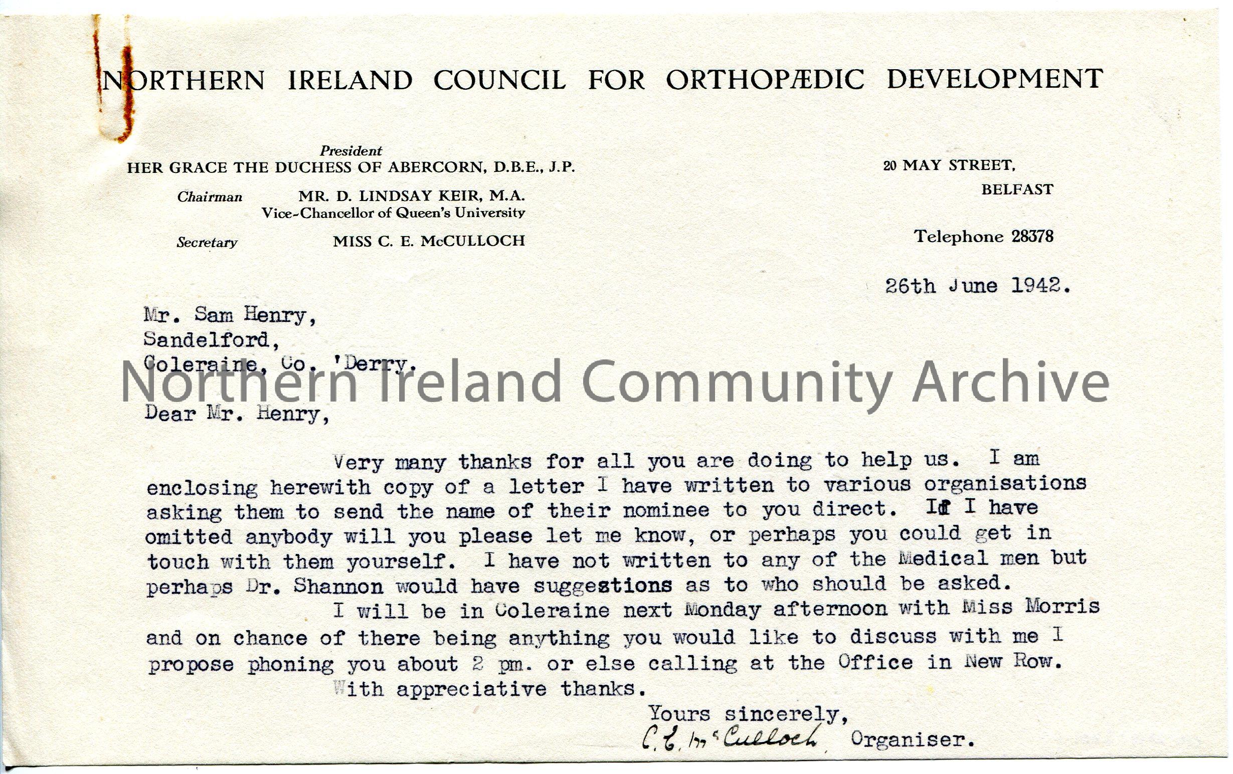 Typed letter on headed paper to Mr Sam Henry, Sandelford, Coleraine, Co. Derry. Thanks Sam for his help. Encloses letter they have written to a number of organisations requesting them to forward the name of their nominees direct to Sam. To phone Sam at 2pm next Monday or Sam to call in to the office in New Row, Coleraine.