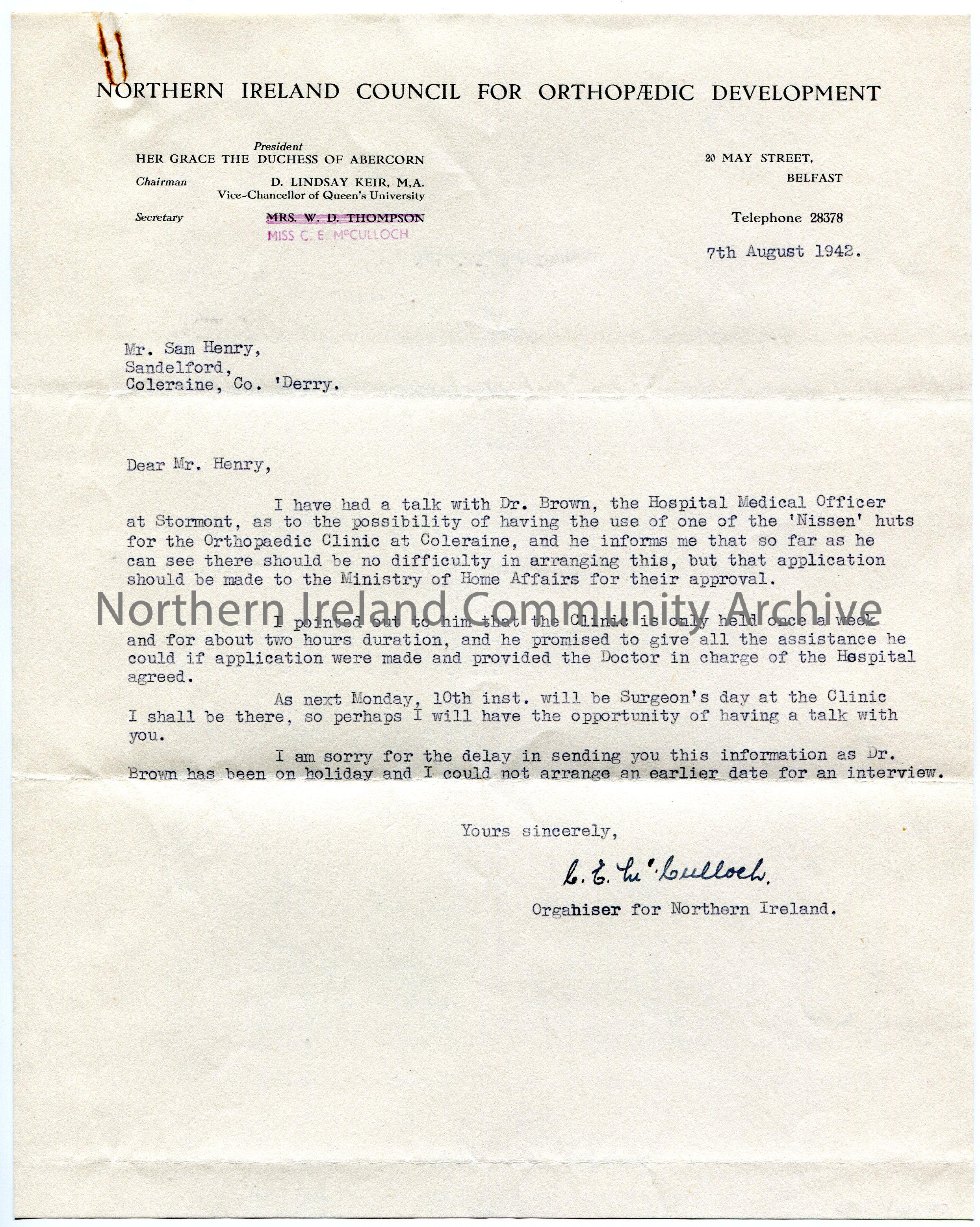 Typed letter on headed paper to Mr Sam Henry, Sandelford, Coleraine, Co. Derry. Writing re the possibility for the Orthopaedic Clinic at Coleraine to operate in one of the Nissen huts at Coleraine.