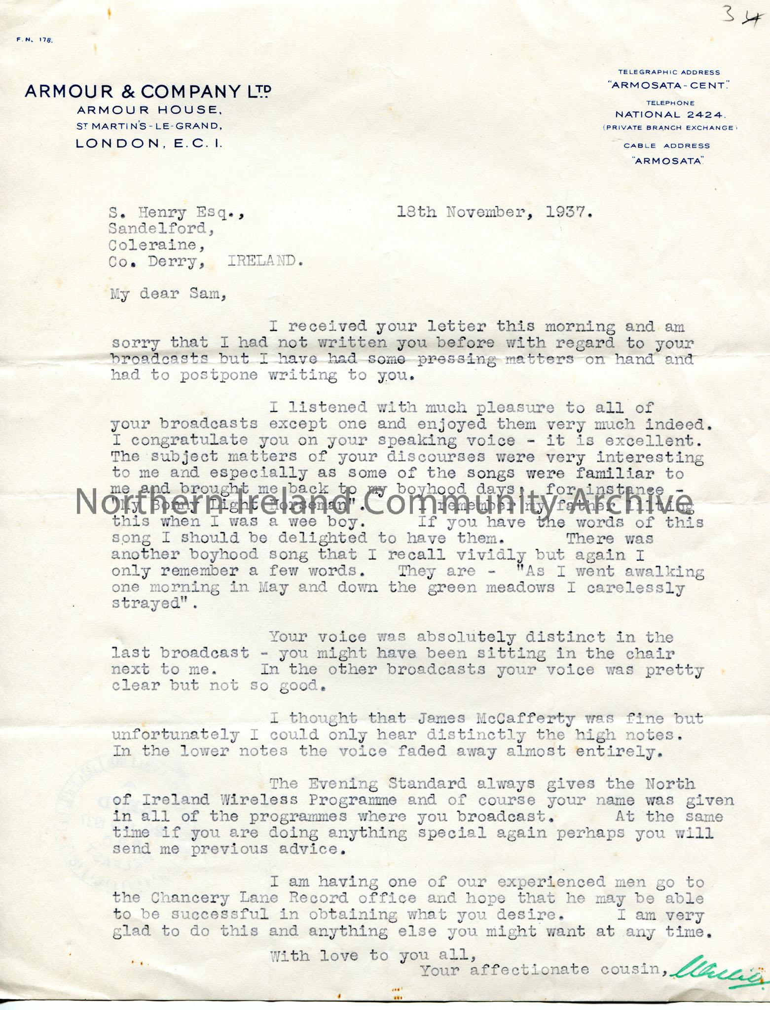 Typed letter on headed paper to S. Henry, Sandelford, Coleraine. Number '3' written top corner in pencil. Apologises for not writing sooner. Writes re Sam's broadcasts and how much he enjoyed them except one. Remembers the song 'The Bonny Light Horseman' and his father singing it when he was younger. Comments on the projection and sound of Sam and James McCafferty's voices. The Evening Standard gave the North of Ireland Wireless Programme which features Sam's name and programmes. Sending staff from Chancery Lane Record Office to obtain something for Sam. Signed off as 'Your affectionate cousin.' Received stamp of BBC Belfast 20th November 1937