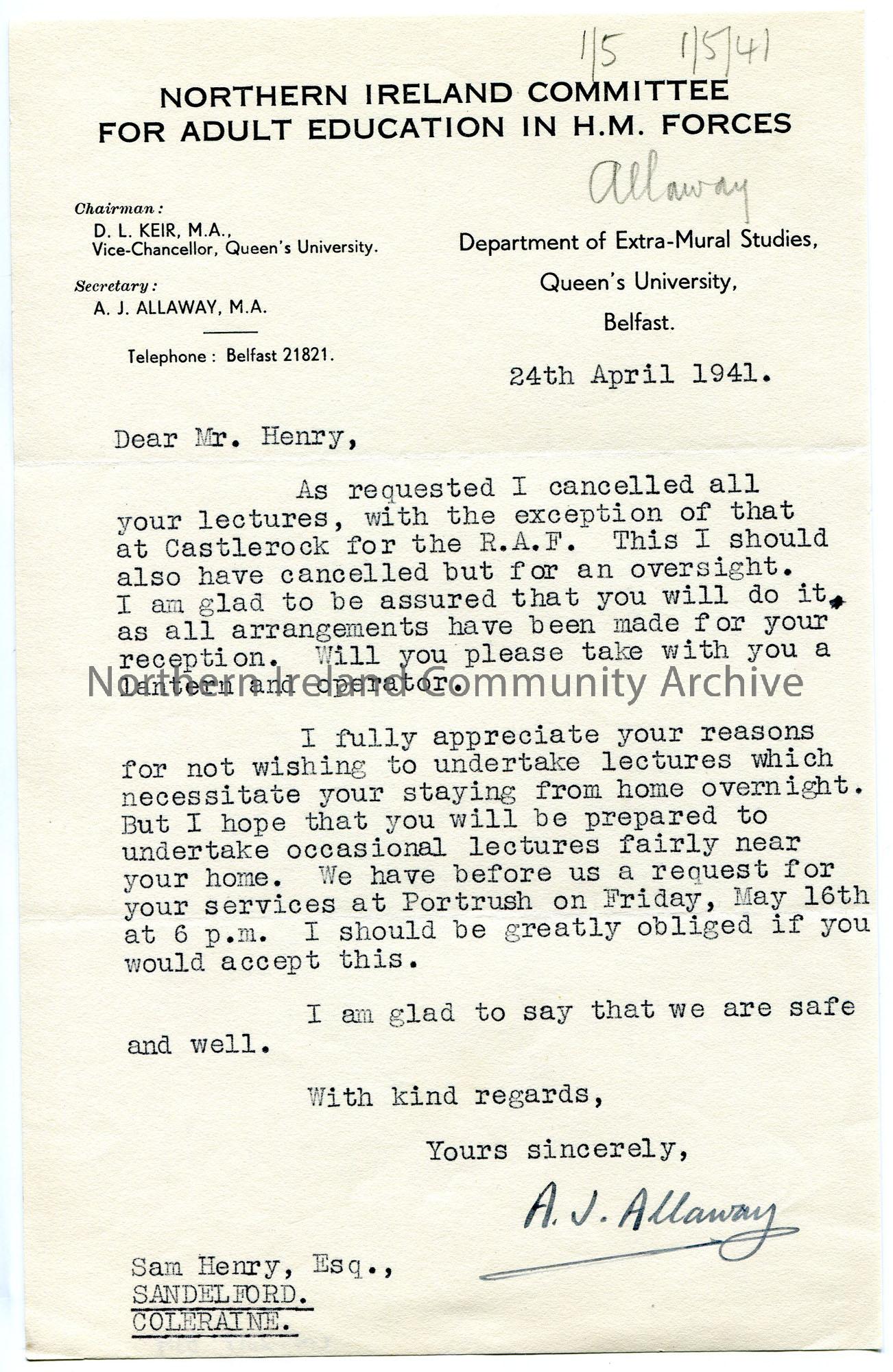 Typed letter on headed paper to Sam Henry. Appreciates Sam's request for cancellation of all lectures that require an overnight stay away from home. [Belfast Blitz occurred at this time]. Hopes Sam can make a lecture at Castlerock for the R.A.F and one at Portrush on 16th May.