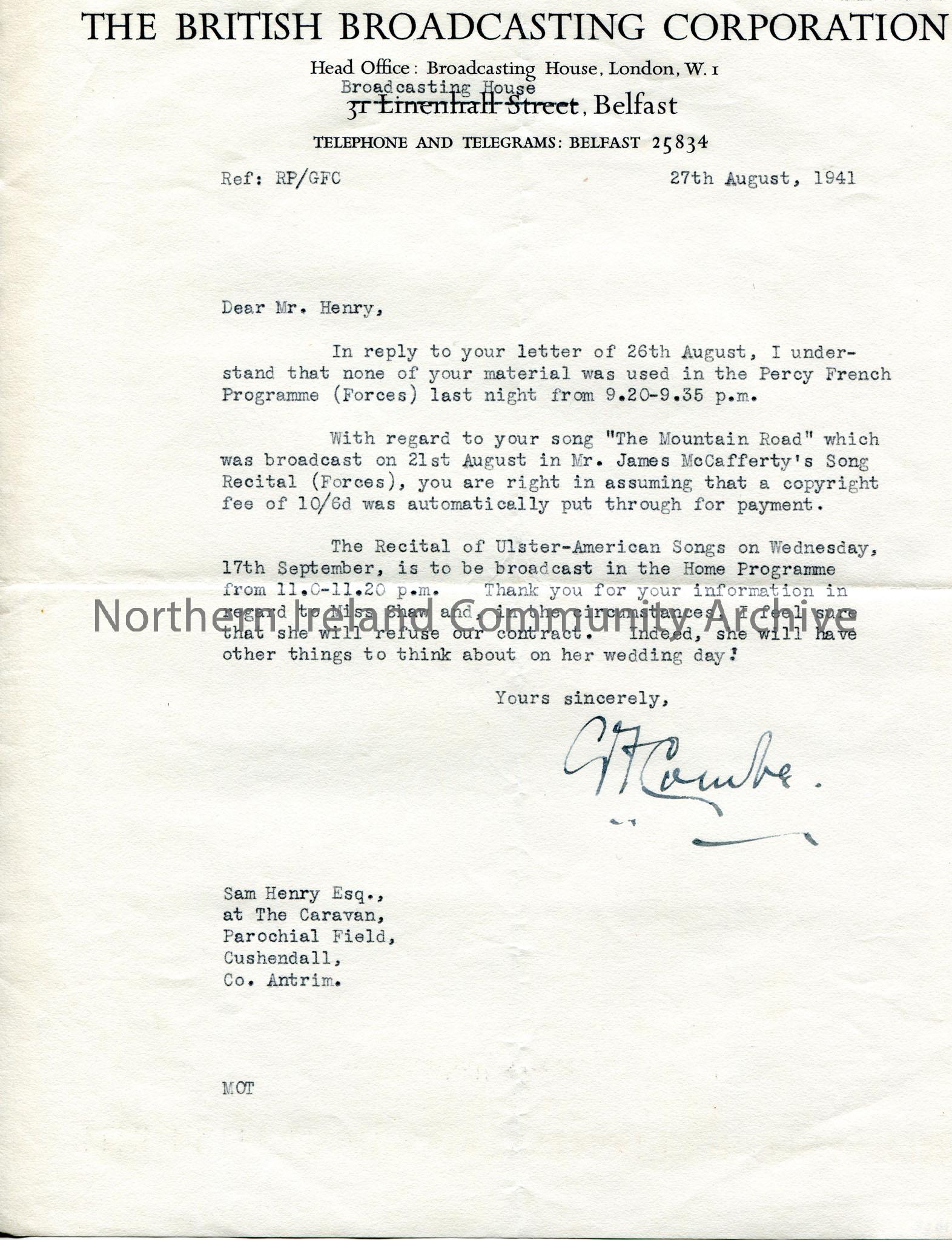 Typed letter on headed paper to Sam Henry at The Caravan, Parochial Field, Cushendall, Co. Antrim. None of Sam's material was used in the Percy French Programme (Forces) last night. Writes re copyright fee for 'The Mountain Road' song in James McCafferty's Song Recital (Forces). The Recital of Ulster-American Songs on Wednesday 17th September is to be broadcast in the Home Programme. Miss Shaw to get married so will not attend.