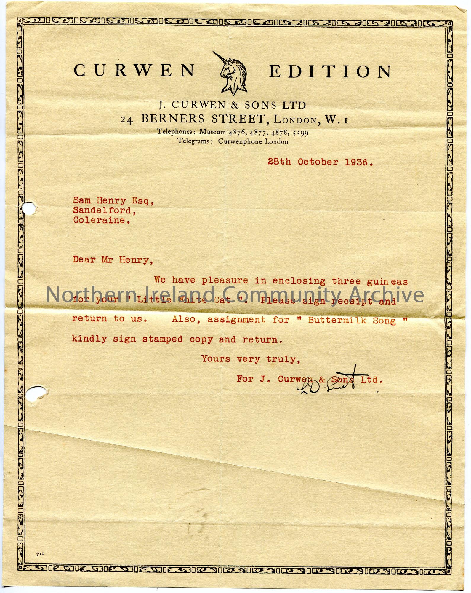 Typed letter on headed paper to Sam Henry. Encloses three guineas for song ‘Little White Cat’. Encloses assignment for ‘Buttermilk Song’.