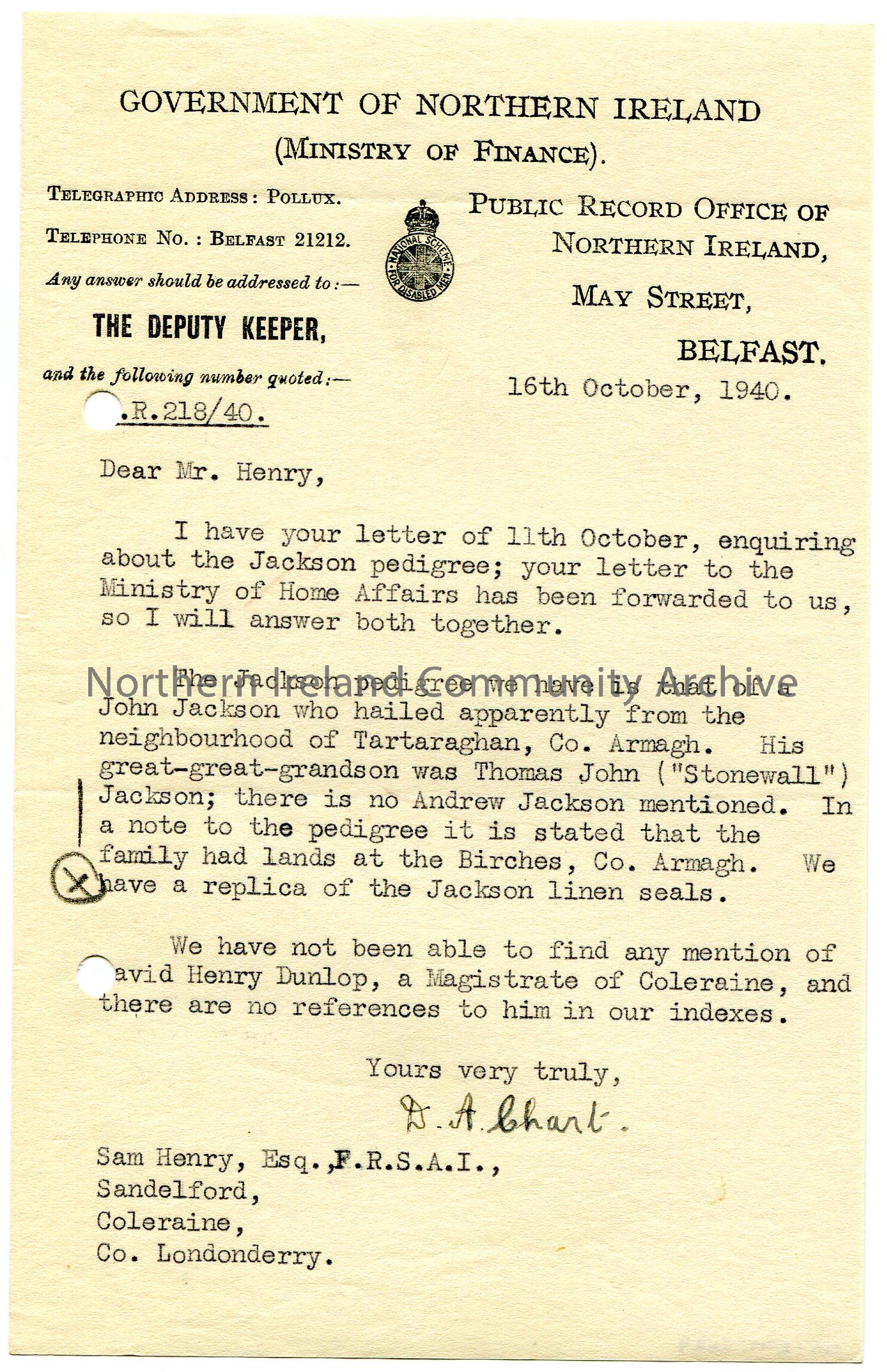 Typed letter on headed paper to Sam Henry, Esq., F.R.S.A.I, Sandelford, Coleraine, Co. Londonderry. Responding to Sam's enquiry re Jackson pedigree. They also checked their indexes for mention of David Henry Dunlop, Magistrate of Coleraine. 'X' in pencil beside note re Jackson linen seals.