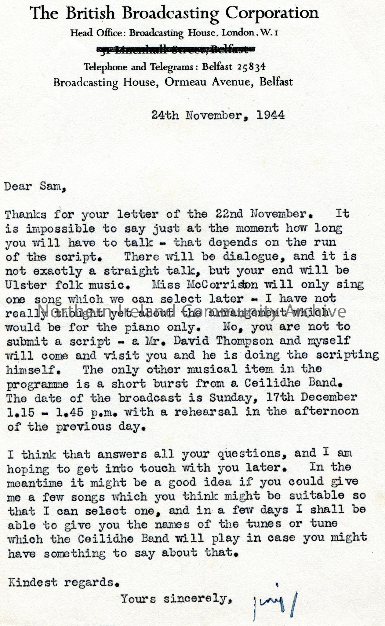Typed letter on headed paper to Sam Henry from the BBC. Discussion of a broadcast to take place on Sunday 17th December. Miss Corriston will sing one song and there will be music from a Ceilidhe Band. Sam to send in a selection of songs of which one will be picked for the broadcast.