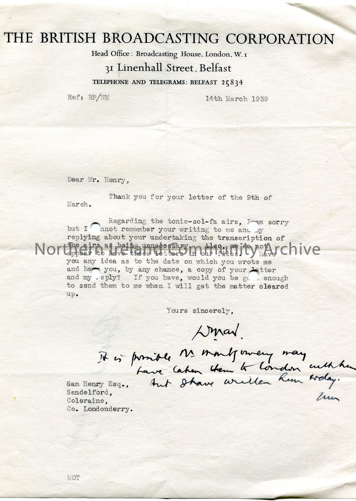 Typed letter on headed paper to Sam Henry from the BBC. Re the tonic sol-fa Airs. The sender of the letter cannot recall if transcription of the Airs was necessary and asks Sam if he has a copy of a letter stating this as there are no copies of the letters on file. Note in pen stating that a Mr Montgomery? may have taken the letters to London.
