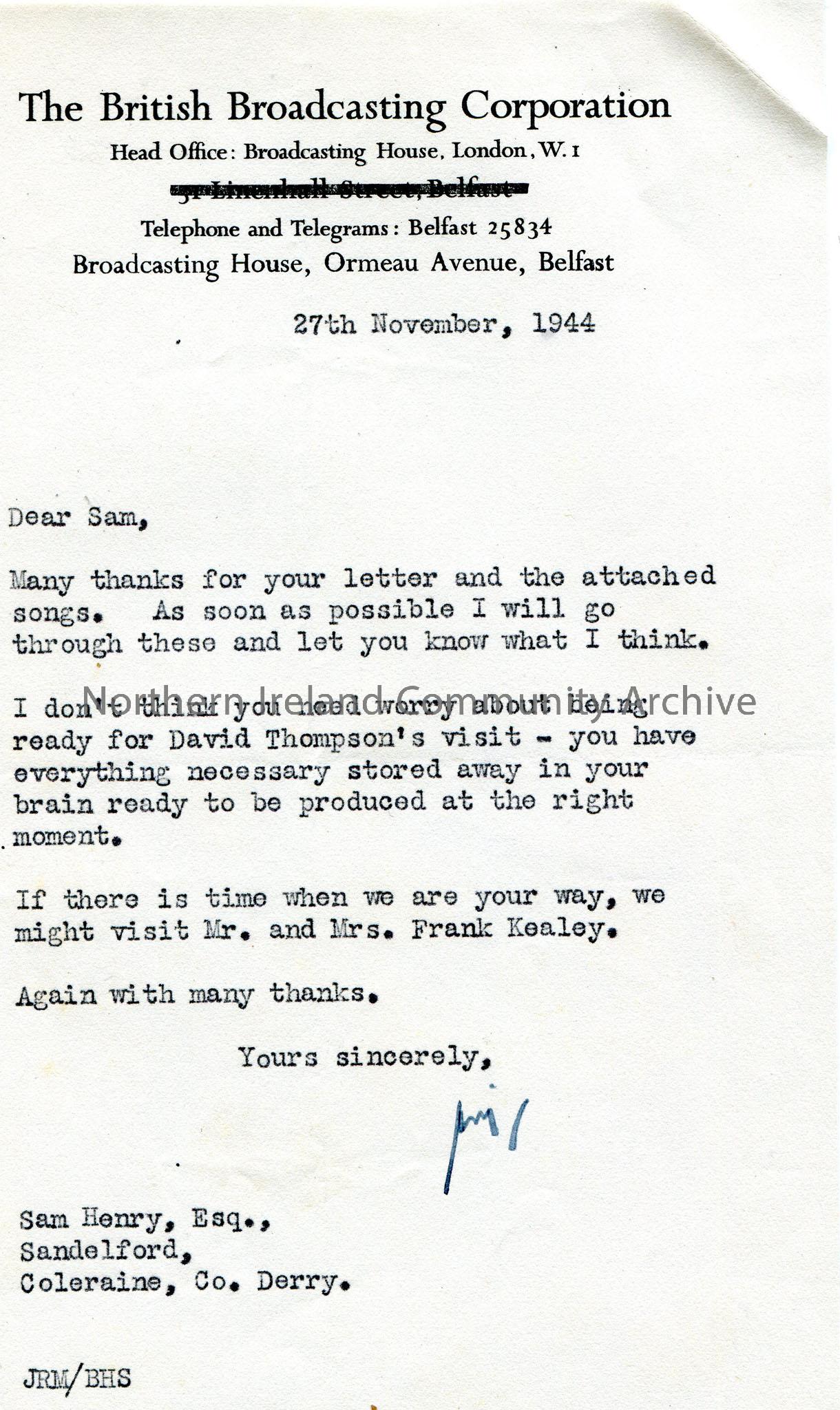 Typed letter on headed paper to Sam Henry from the BBC. Thanks Sam for the letter and attached songs which they will go through and let Sam know what they think. Writes that Sam has no preparation to do for David Thompson's visit. May visit Mr and Mrs Frank Kealey.