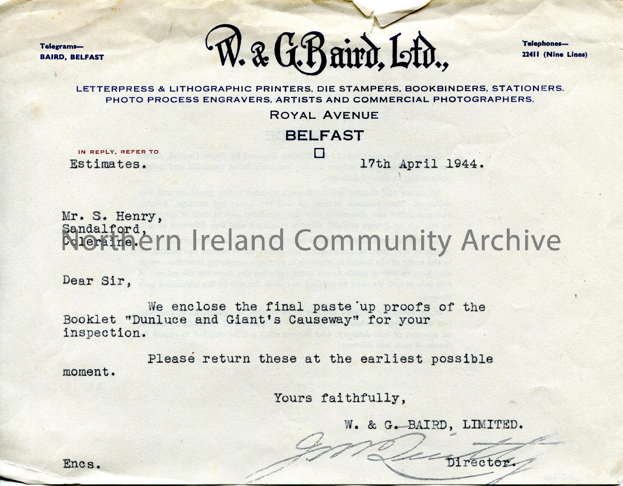 Typed letter on headed paper to Sam Henry from W & G Baird Ltd. Encloses final copy of proofs for Sam Henry's booklet 'Dunluce and Giant's Causeway' for his inspection.