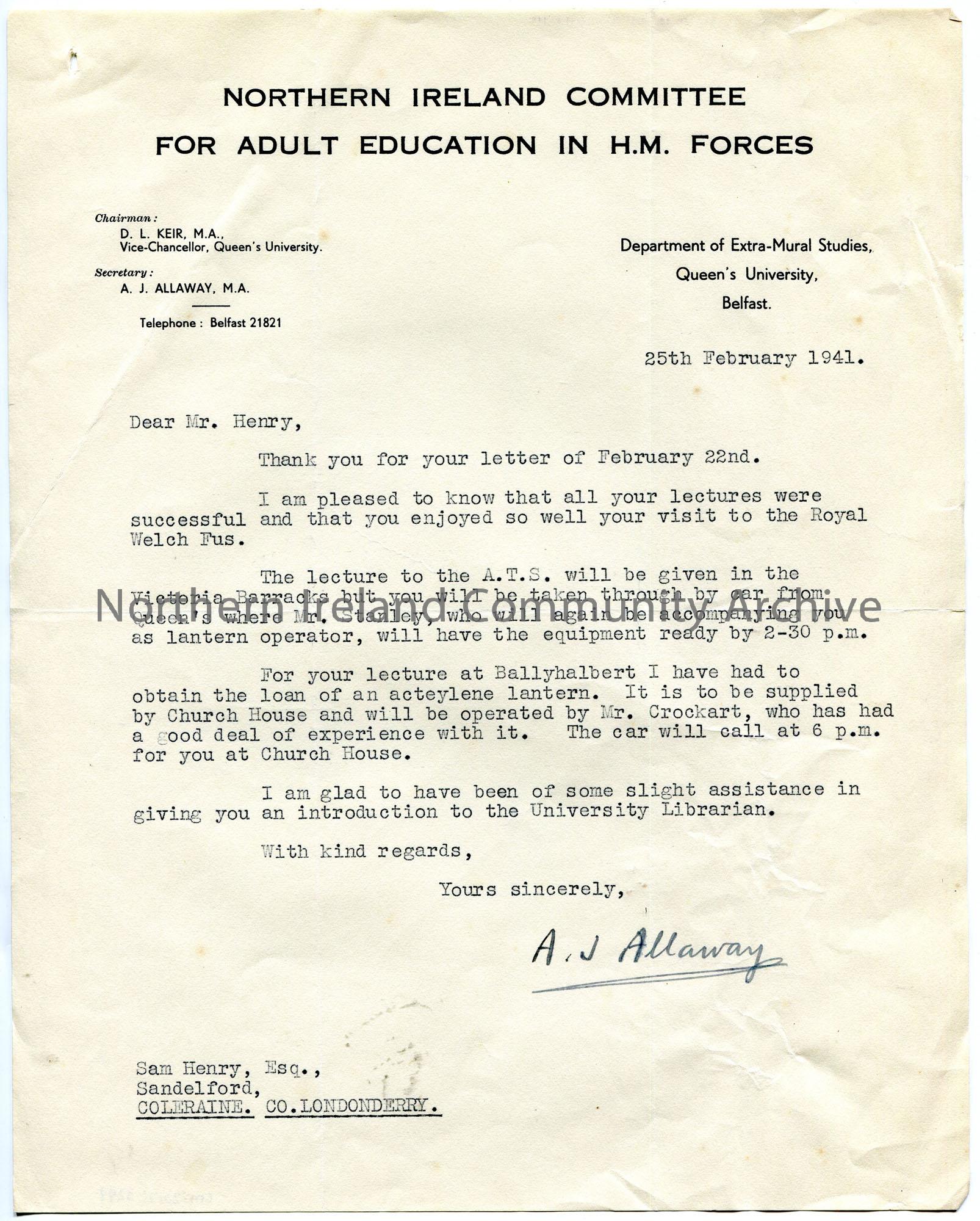Typed letter on headed paper to Sam Henry. Pleased that Sam has enjoyed a visit to the Royal Welsh Fusiliers. Confirms arrangements for lecturtes at the A.T.S. in Belfast and at Ballyhalbert. Glad to have introduced Sam to the University Librarian.