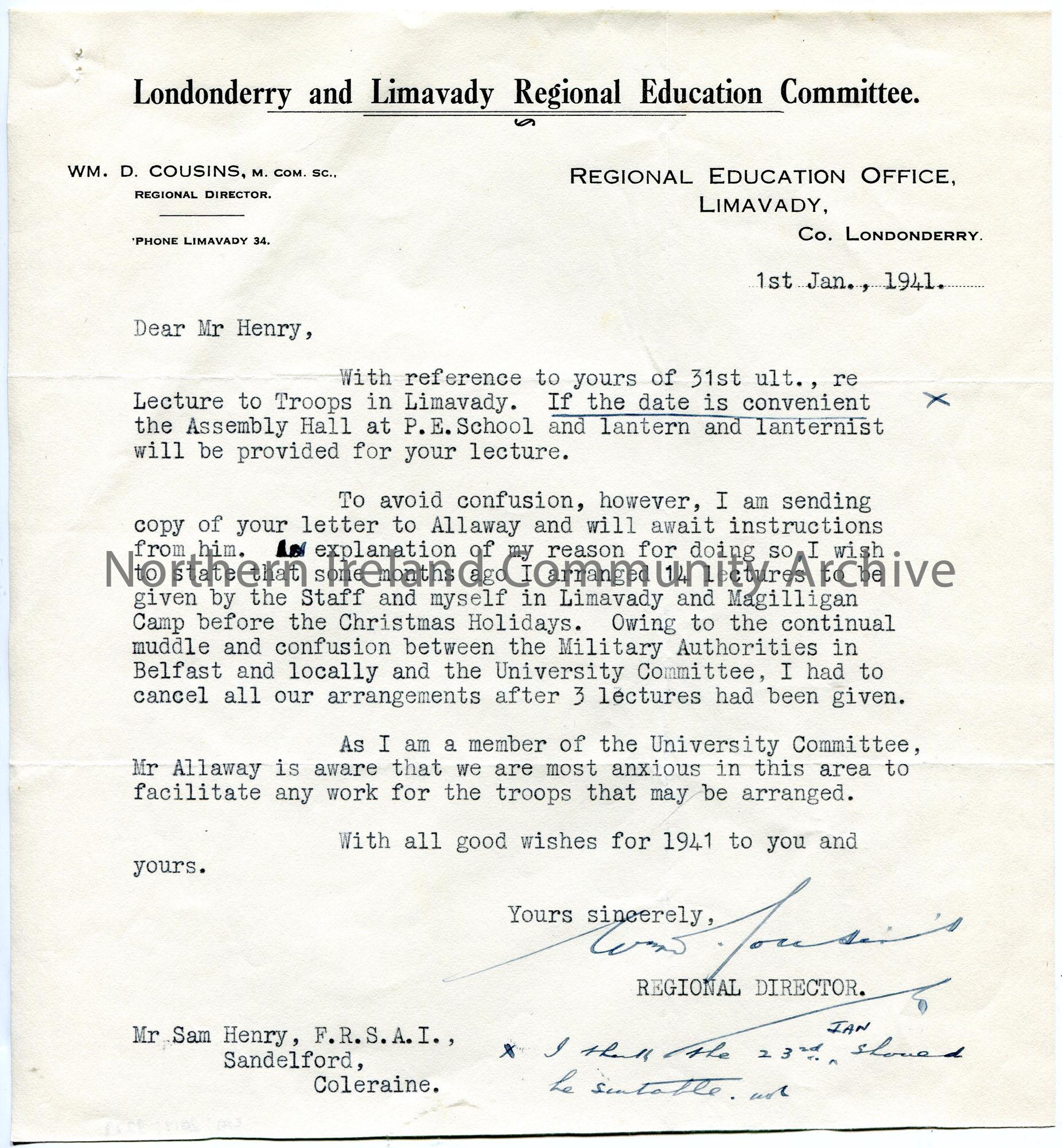 Typed letter on headed paper to Sam Henry re lecture to Troops in Limavady. Sending copy of letter to Mr Allaway to avoid confusion between Military A…